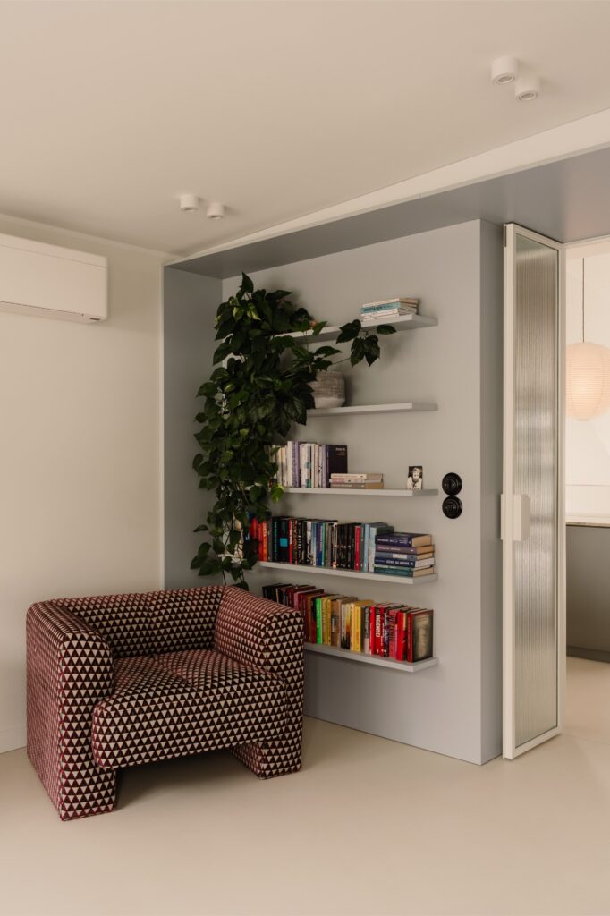 Os proprietários pretendiam que o interior permanecesse sereno e luminoso. A maioria das paredes foi tratada de forma contida, permitindo que as superfícies claras se adaptem e transformem com a mudança da luz.