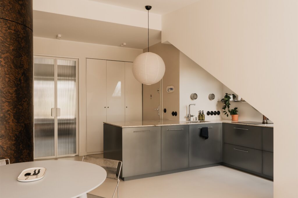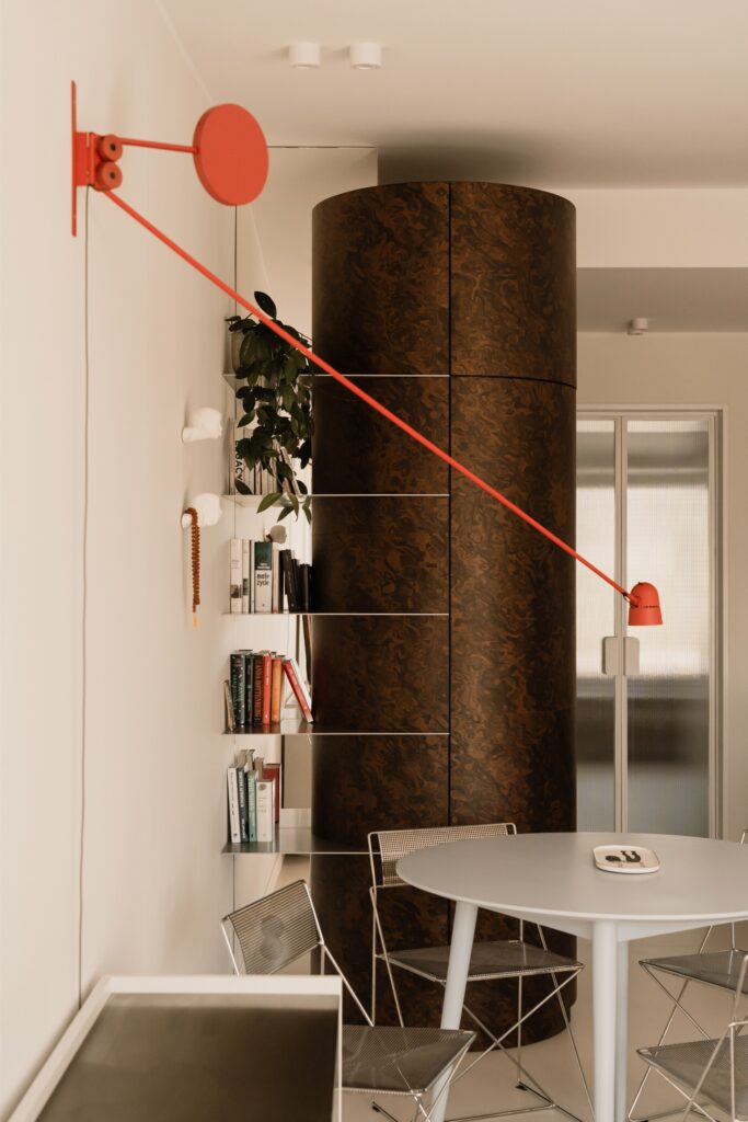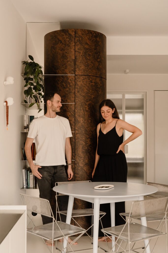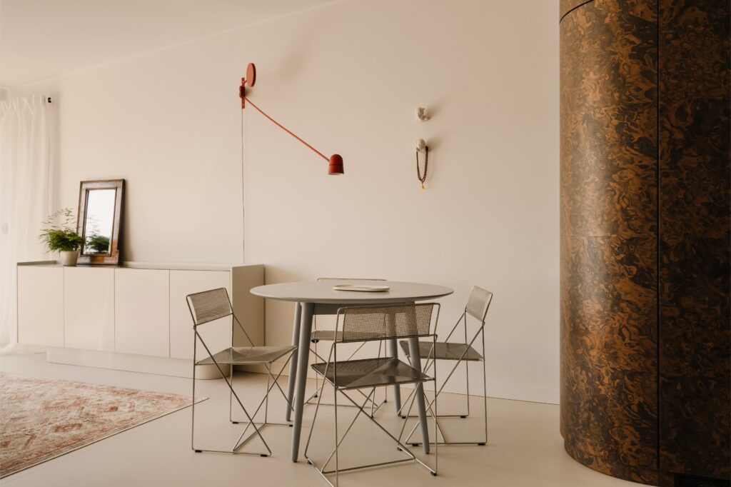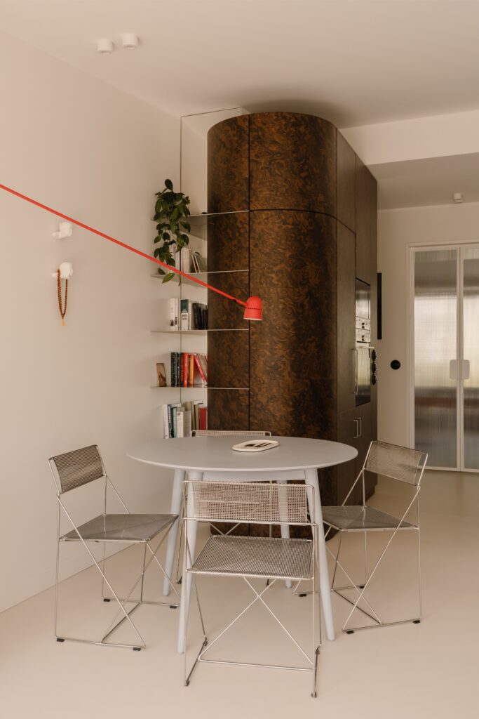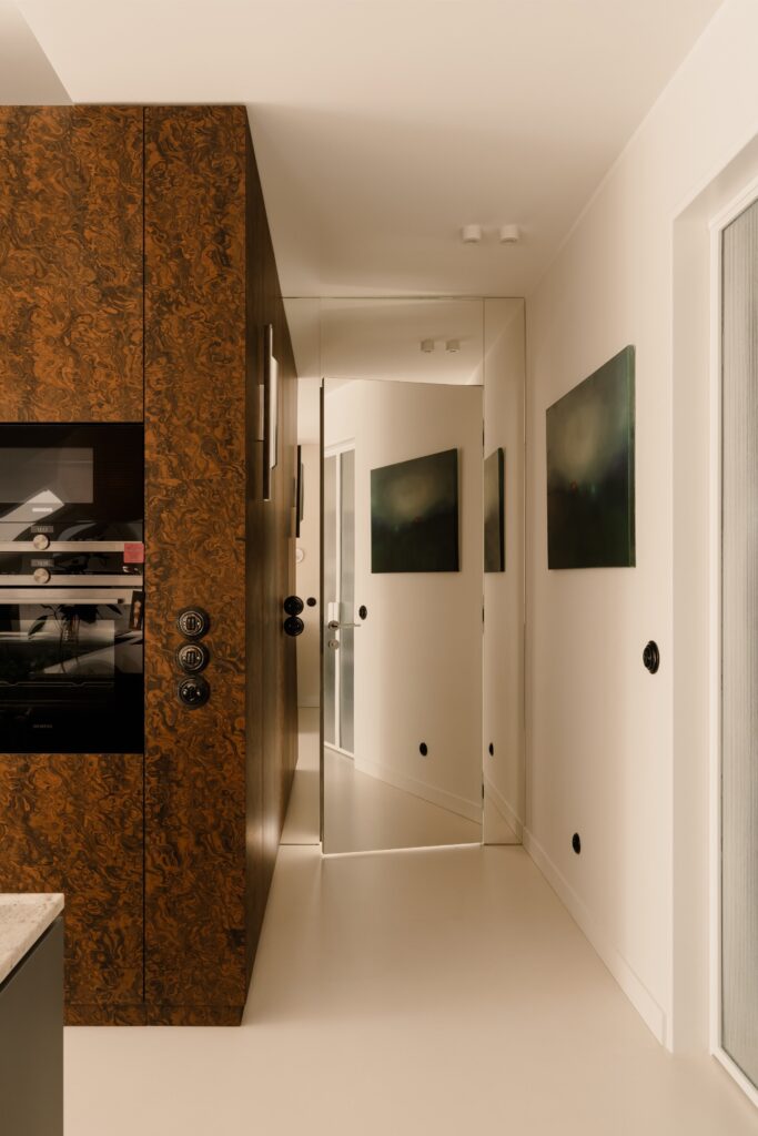 A cozinha, de mobiliário baixo, segue o mesmo princípio: frentes em aço inox e uma bancada de pedra clara refletem suavemente o espaço e fragmentos de luz. A tonalidade tranquila é interrompida por alguns acentos deliberados, o mais marcante dos quais é o módulo alto da cozinha – um volume semi-isolado inteiramente revestido a raiz de padauk em tom chocolate. A sua aresta suavemente arredondada evoca as formas aerodinâmicas do modernismo de Gdynia dos anos 1930 – uma referência discreta às origens costeiras dos proprietários. Um motivo semelhante surge no quarto, onde parte do mobiliário embutido cria uma transição suave entre zonas funcionais.