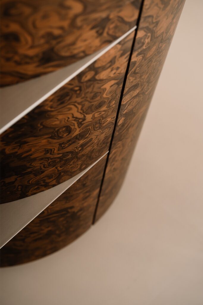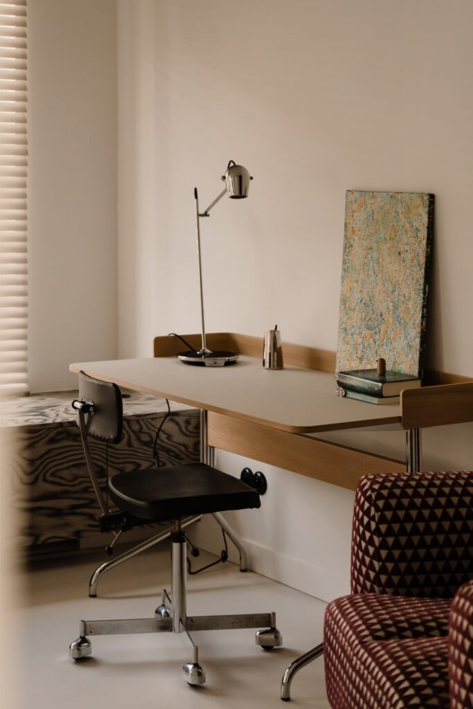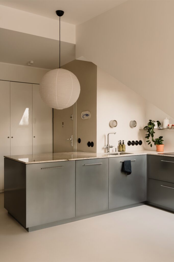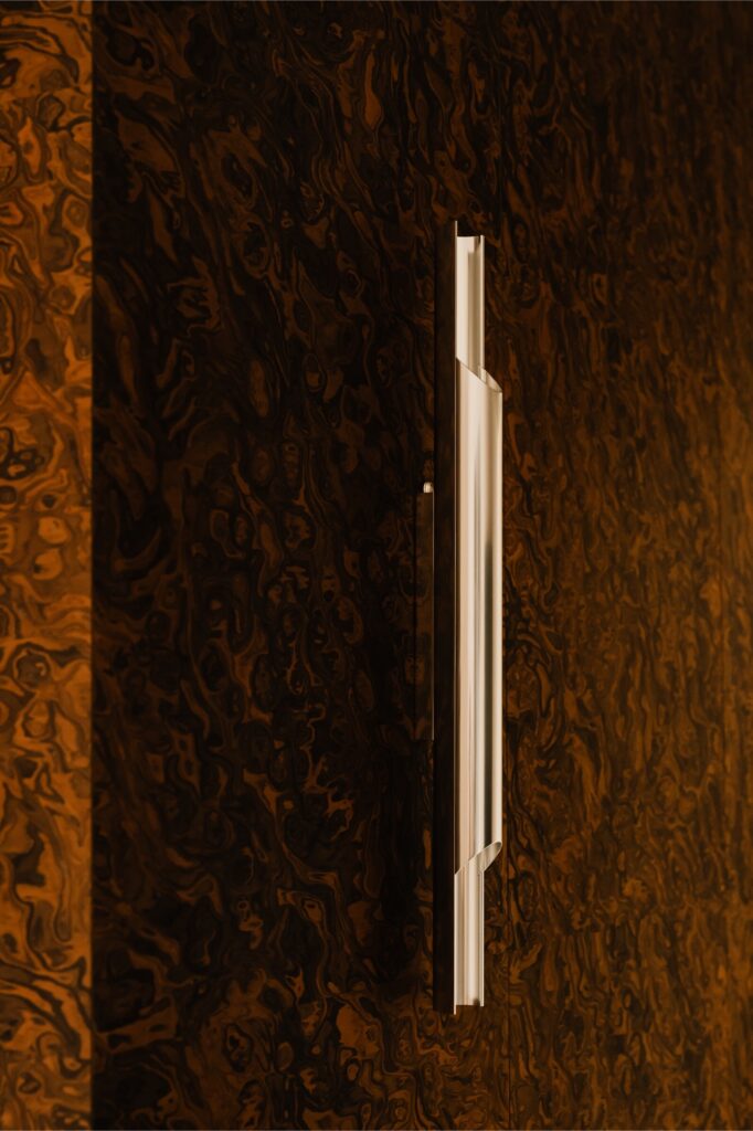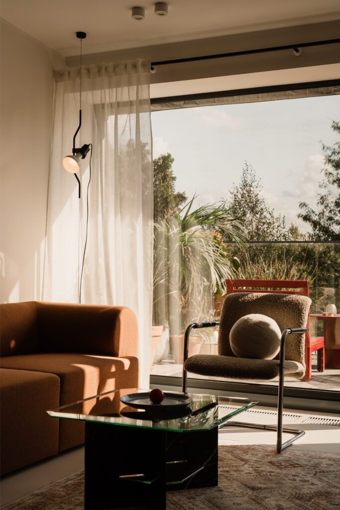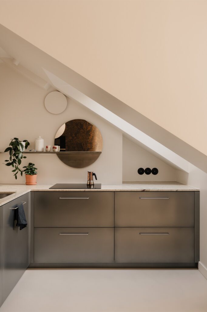 A cozinha, de mobiliário baixo, segue o mesmo princípio: frentes em aço inox e uma bancada de pedra clara refletem suavemente o espaço e fragmentos de luz. A tonalidade tranquila é interrompida por alguns acentos deliberados, o mais marcante dos quais é o módulo alto da cozinha – um volume semi-isolado inteiramente revestido a raiz de padauk em tom chocolate. A sua aresta suavemente arredondada evoca as formas aerodinâmicas do modernismo de Gdynia dos anos 1930 – uma referência discreta às origens costeiras dos proprietários. Um motivo semelhante surge no quarto, onde parte do mobiliário embutido cria uma transição suave entre zonas funcionais.
