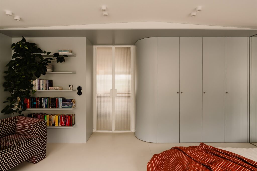 Na zona norte do apartamento, onde originalmente existiam dois quartos mais pequenos, criou-se um único quarto amplo, complementado por um closet e uma pequena área de trabalho. Uma das paredes é revestida por armários embutidos em azul-claro que se prolongam até uma pequena estante, unificados visualmente por um “cornija” horizontal no mesmo tom. De um lado, portas espelhadas dão acesso ao closet; do outro, um assento embutido em folha de madeira desenhada por Ettore Sottsass resolve as irregularidades resultantes da fusão dos dois antigos quartos. O quarto abre-se para o hall e a área social através de largas portas duplas com vidro canelado. Esta abertura generosa reforça a sensação de continuidade e liga duas vistas extraordinárias – o vale do Vístula e a Floresta Wolski.