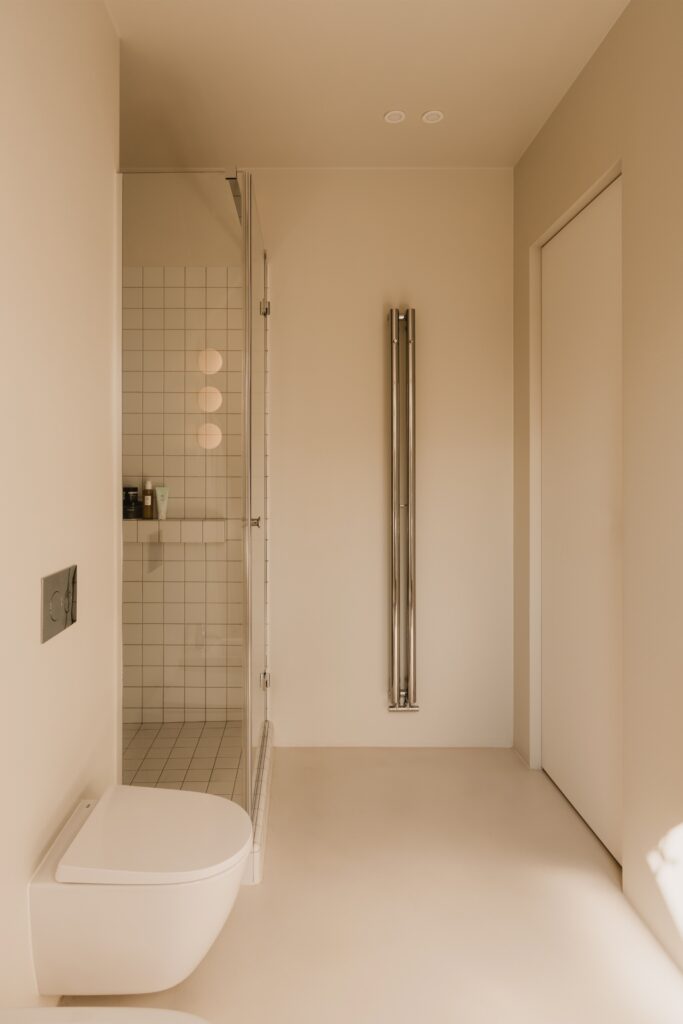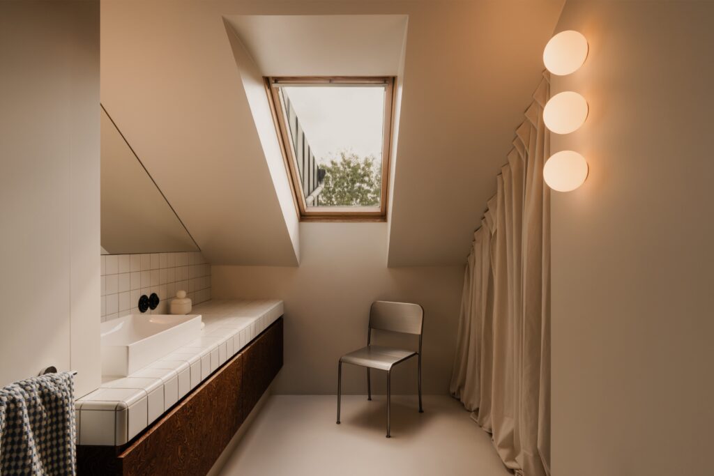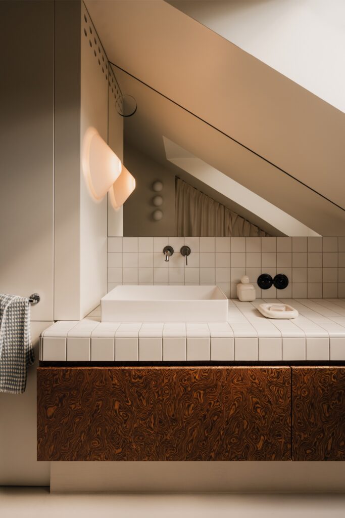 A casa de banho, tal como o resto do interior, define-se por uma paleta clara em que o branco se expressa através de diferentes texturas e tonalidades. A cabine de duche e a bancada são acabadas com pequenas peças cerâmicas da Vogue Ceramica. Um nicho técnico que aloja a máquina de lavar e a de secar está oculto por uma cortina creme, que acompanha o tom das paredes e do mobiliário embutido. Sobre este fundo luminoso, destaca-se o móvel sob o lavatório, revestido em raiz de madeira num tom quente e avermelhado.