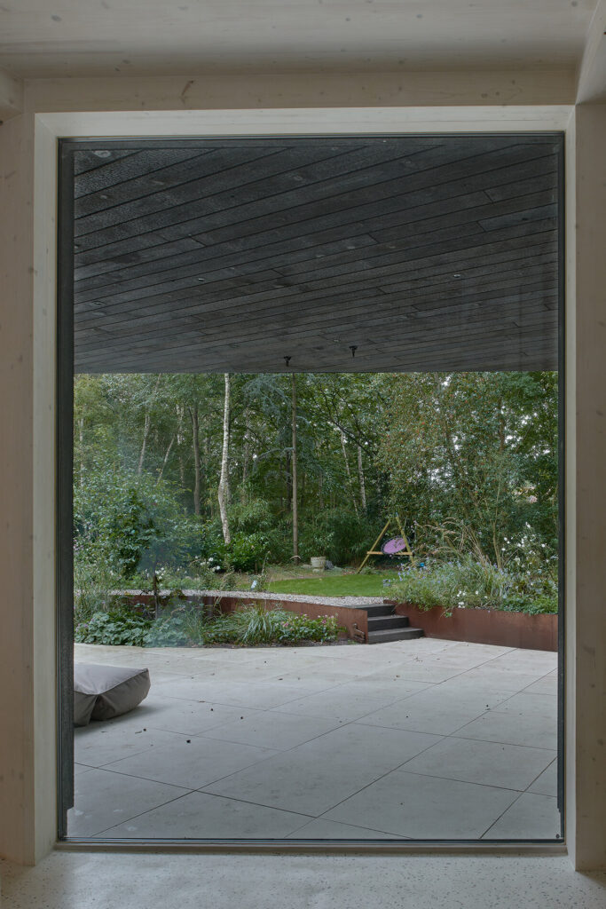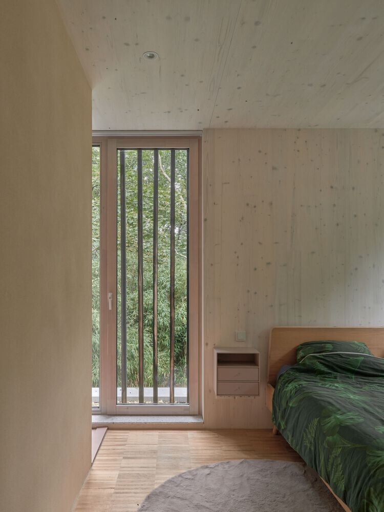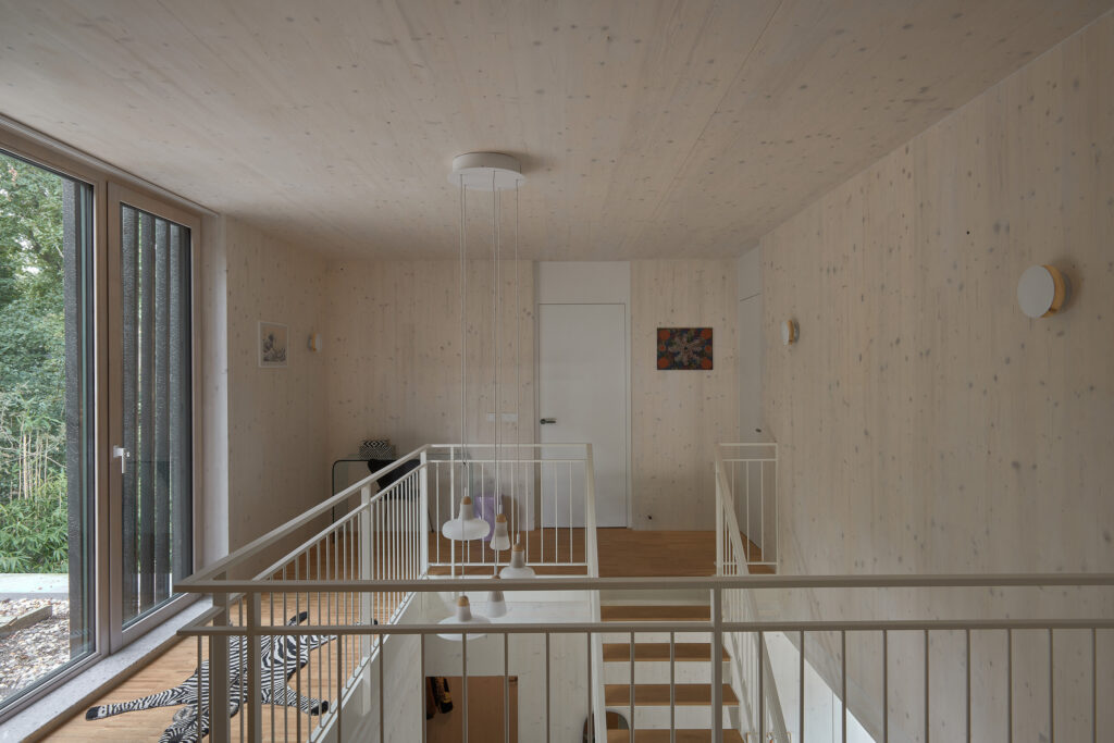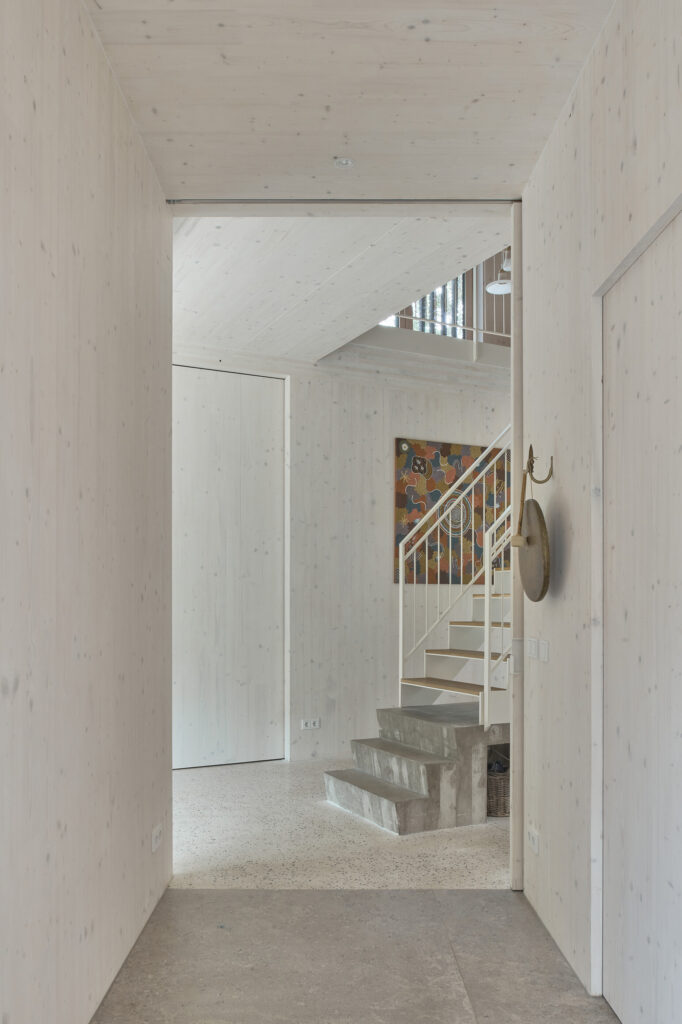 Grandes aberturas de vidro estão dispostas entre os painéis de CLT, trazendo literalmente o exterior para o interior. No interior, a casa transmite uma sensação de leveza e aconchego. A madeira natural visível por toda a parte, combinada com paredes de barro e isolamento de fibra de madeira, promove um equilíbrio de humidade agradável e um clima interior saudável.