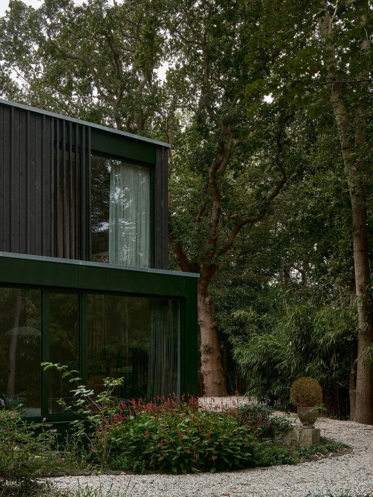 Situada na exuberante floresta de Oostvoorne, Holanda, esta casa familiar foi concebida para se integrar na natureza. Os três volumes do piso térreo estão ligeiramente recuados em relação ao solo, oferecendo vistas de cada ala para diferentes secções do jardim, meticulosamente planeado.
