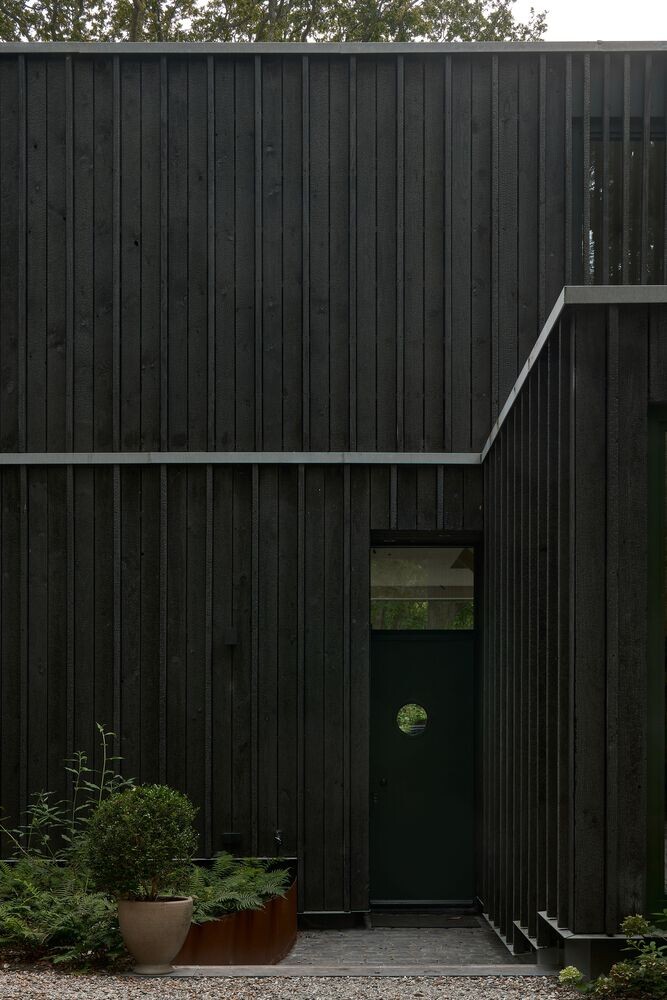 Para harmonizar com a envolvente verde da floresta, a fachada é feita em madeira Accoya carbonizada e detalhes em alumínio verde. O ritmo limpo das tábuas e das vigas joga com as linhas horizontais que enfatizam os volumes de CLT.