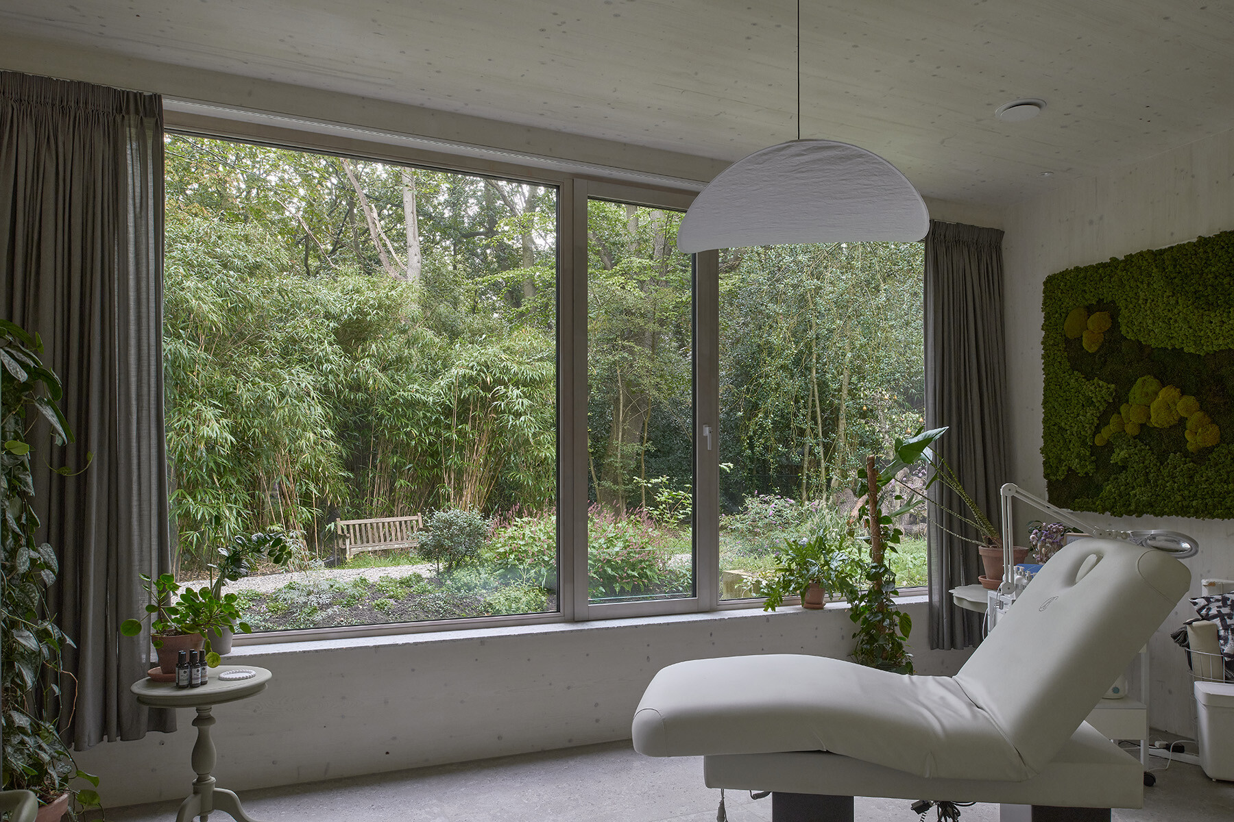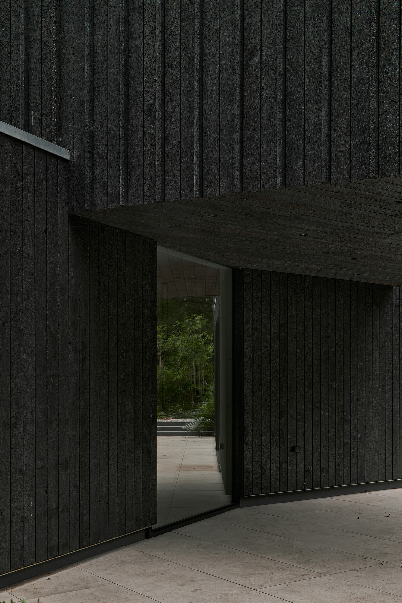 Para harmonizar com a envolvente verde da floresta, a fachada é feita em madeira Accoya carbonizada e detalhes em alumínio verde. O ritmo limpo das tábuas e das vigas joga com as linhas horizontais que enfatizam os volumes de CLT.