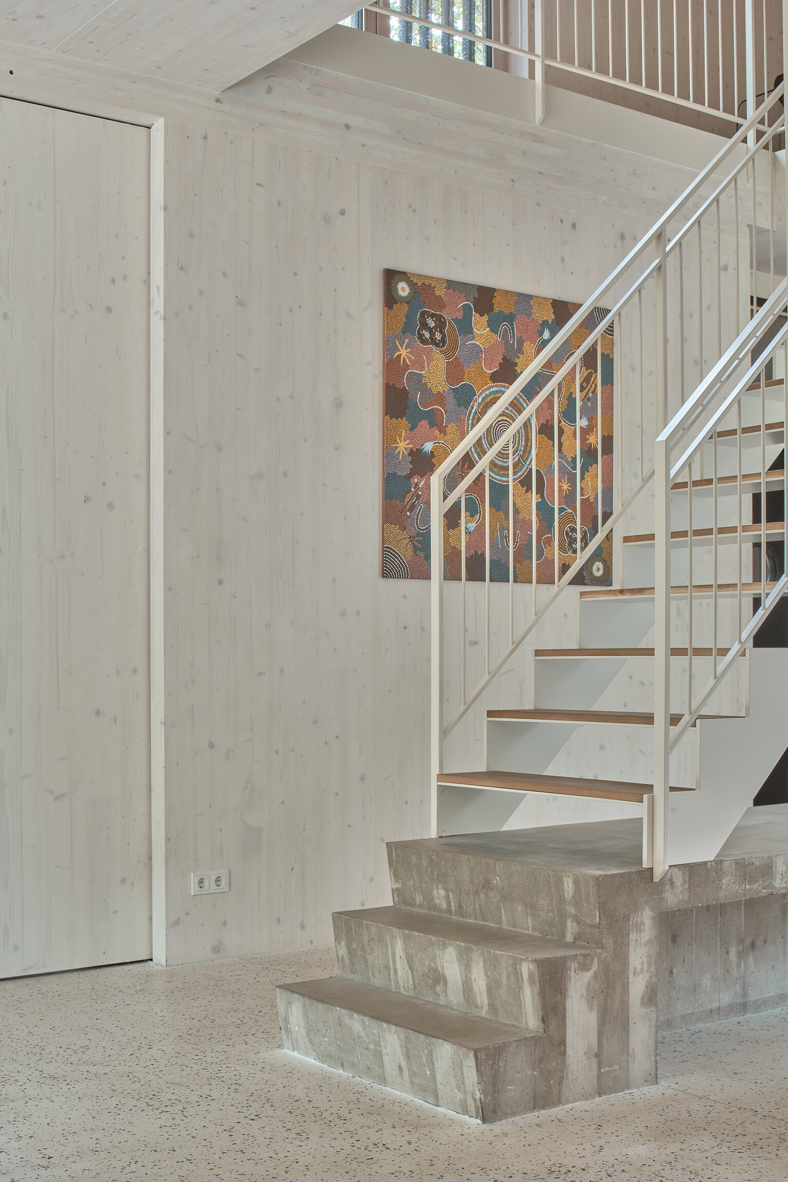 Grandes aberturas de vidro estão dispostas entre os painéis de CLT, trazendo literalmente o exterior para o interior. No interior, a casa transmite uma sensação de leveza e aconchego. A madeira natural visível por toda a parte, combinada com paredes de barro e isolamento de fibra de madeira, promove um equilíbrio de humidade agradável e um clima interior saudável.
