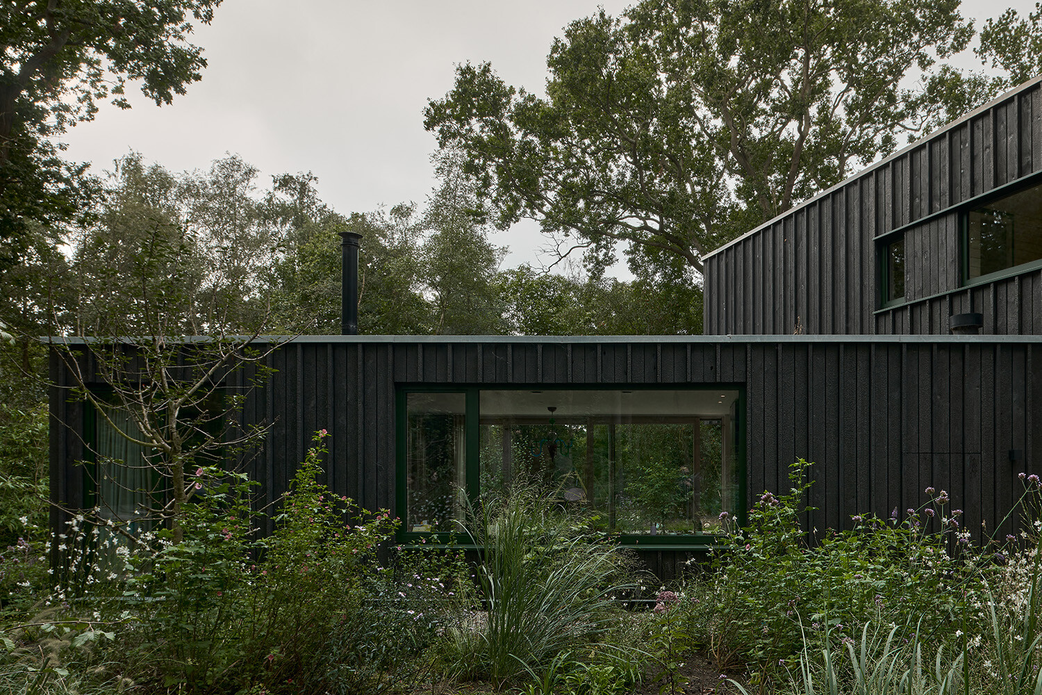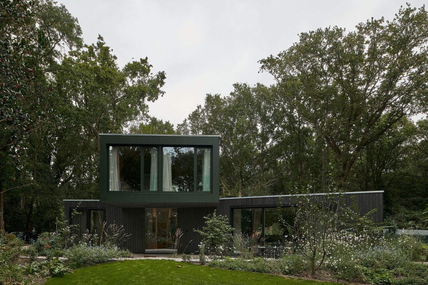 Situada na exuberante floresta de Oostvoorne, Holanda, esta casa familiar foi concebida para se integrar na natureza. Os três volumes do piso térreo estão ligeiramente recuados em relação ao solo, oferecendo vistas de cada ala para diferentes secções do jardim, meticulosamente planeado.