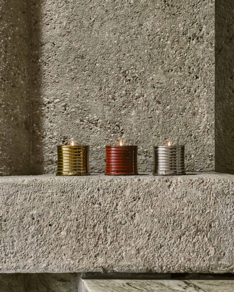 As velas Black Sesame, Earl Grey e Sweet Almond são apresentadas em recipientes de acabamento metálico vidrado nas cores Prateado, Dourado e Vermelho Brilhante, no formato médio de 280 g. Cada vela LOEWE Home Scents é feita com cera natural e pavios de algodão, e vem num recipiente de terracota com a base marcada pelo Anagrama da marca. Devido ao seu fabrico artesanal, não existem duas velas exatamente iguais.