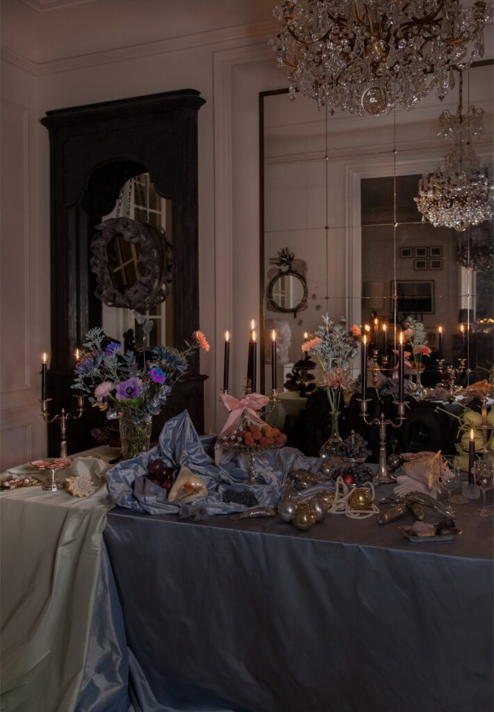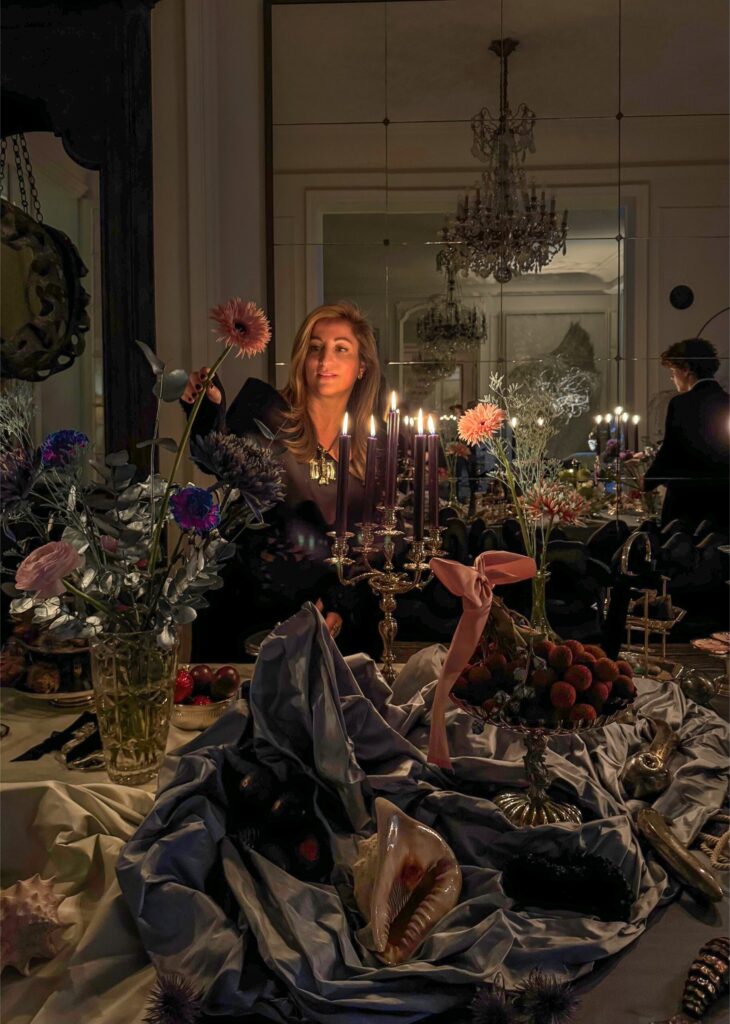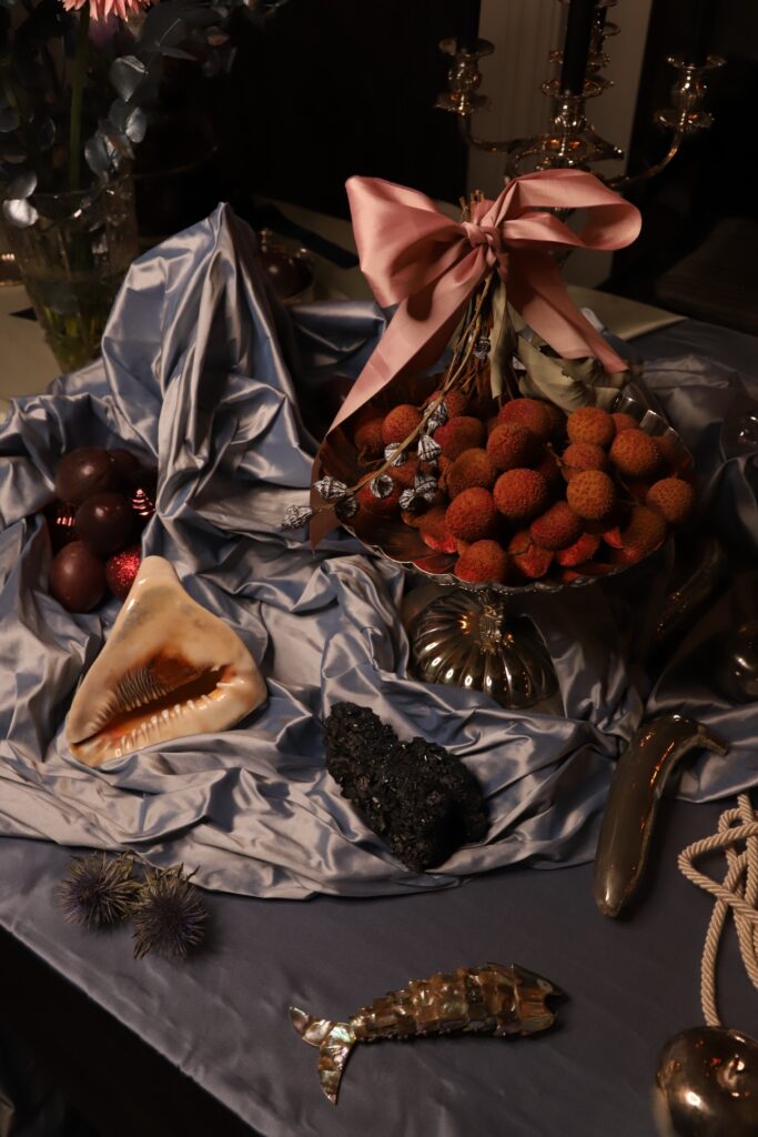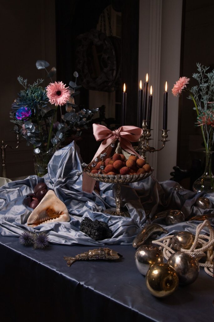 Numa composição que presta homenagem à estética surrealista, Aline mistura elementos como maçãs cintilantes, pratas antigas de família, vasos contemporâneos, objetos de inspiração marinha e arranjos florais exuberantes sobre texturas ricas e tons sombrios