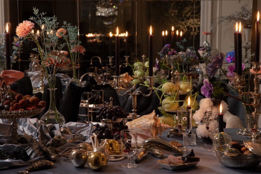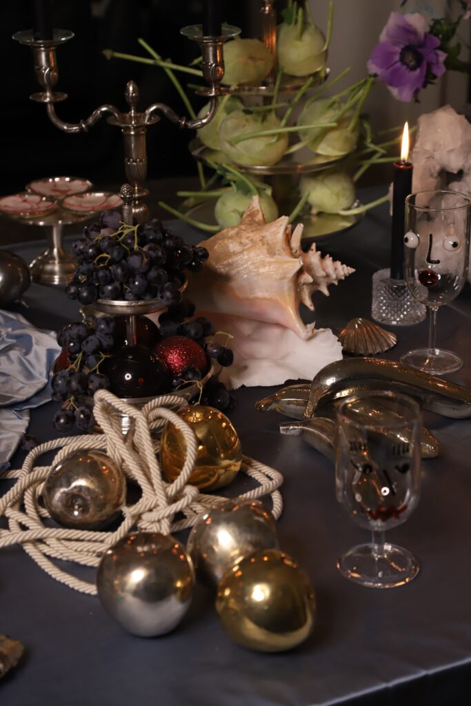 O tremeluzir das velas roxo-escuro nos majestosos candelabros de prata acrescentam fantasia e drama. E nos pratos, frutos exóticos acompanham bolas de vidro pintadas à mão da Bloom Paris e um conjunto vintage único de maçãs e bananas douradas e prateadas patinadas, um achado raro no labirinto de louças da La Table d’Eva no mercado de antiguidades de Paul Bert Serpette.