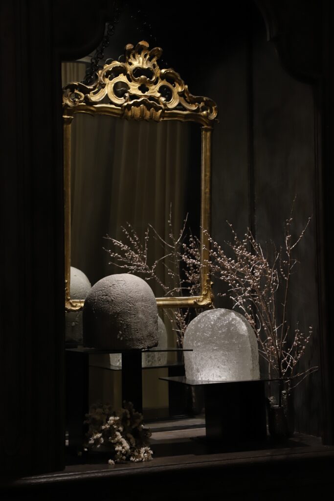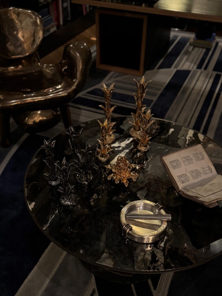 A criação contemporânea também se senta à mesa deste festim ecléctico com uma colecção de copos de Murano únicos, com adoráveis rostos desenhados por Sam Baron e Massimo Lunardon, encontrados na alegre pop-up “Attention, Fragile!” de Sarah Andelman na Sotheby’s, na rue du Faubourg Saint-Honoré. As grandes peças são obras únicas de Lukas Wegwerth e as flores são da Debeaulieu!
