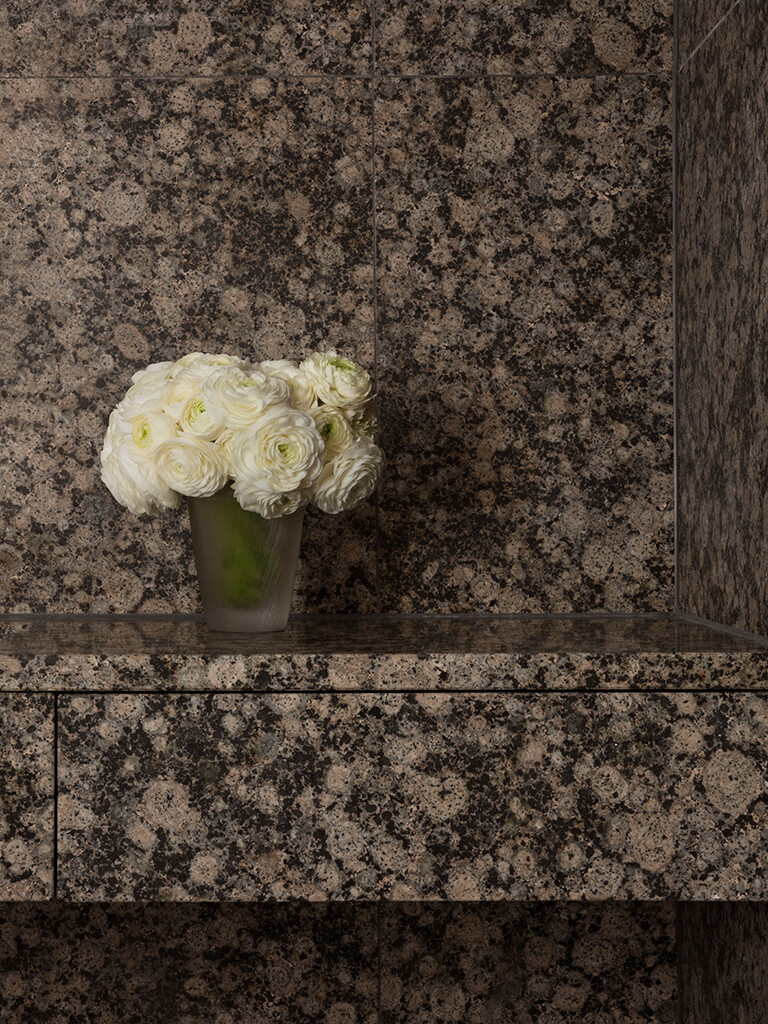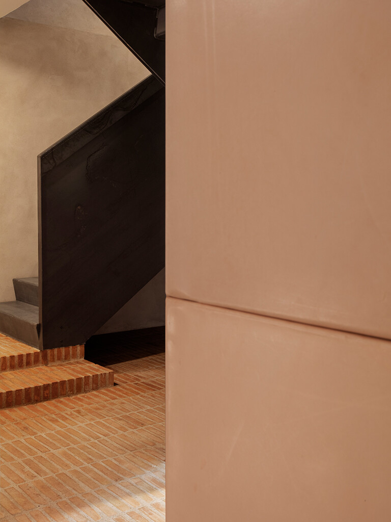 O couro Sorensen, proveniente dos melhores produtores da Dinamarca, é utilizado para revestir o elevador, fazendo referência à história do edifício como armazém de couro e conferindo aconchego e textura a cada apartamento.
