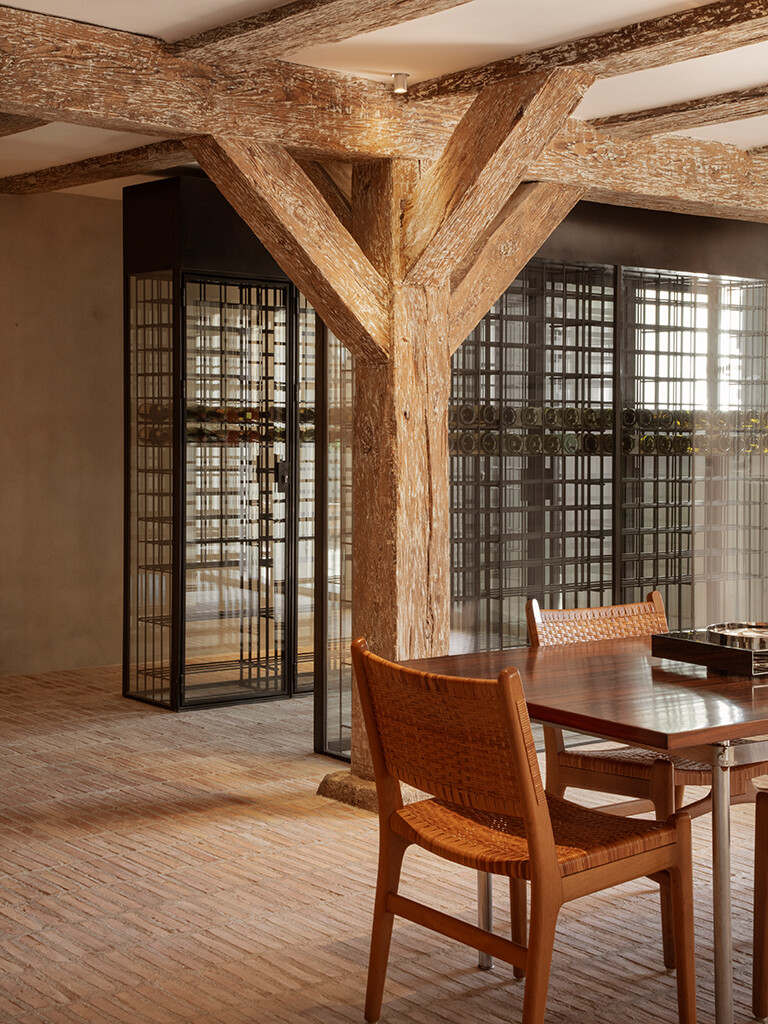 Uma paleta de materiais naturais, incluindo tábuas de madeira Dinesen, realça a beleza da estrutura original, elevando habilmente os seus componentes mais simples.