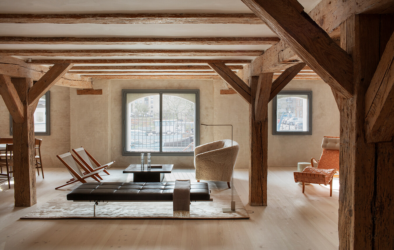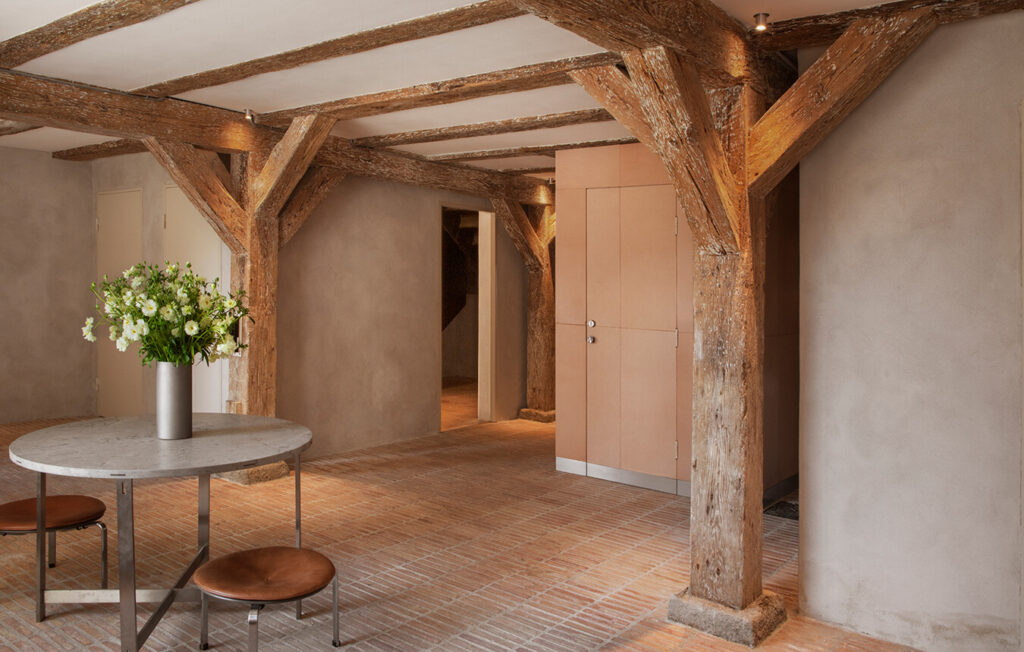 Uma paleta de materiais naturais, incluindo tábuas de madeira Dinesen, realça a beleza da estrutura original, elevando habilmente os seus componentes mais simples.