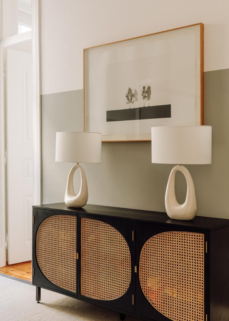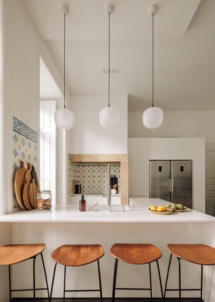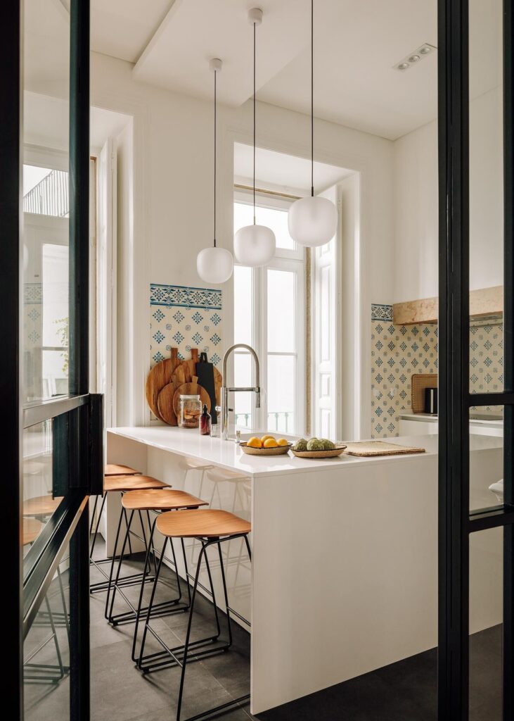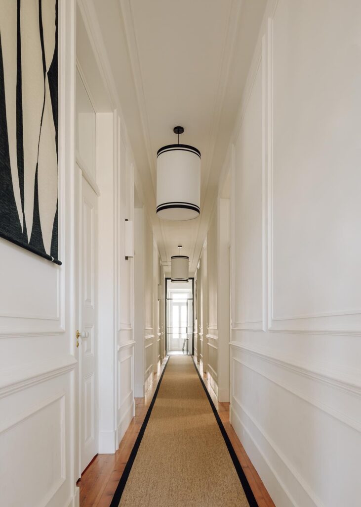 A sala de estar ancora o projecto com uma sofisticação discreta, o corredor transforma-se numa galeria rítmica, e a cozinha combina simplicidade com tradição portuguesa através dos seus materiais e função.