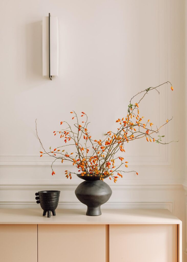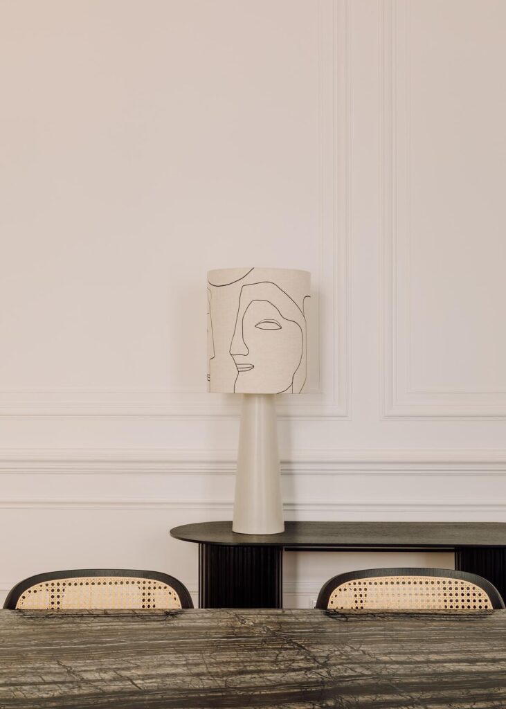 Silhuetas arredondadas, mesas monolíticas, cerâmicas orgânicas, texturas tecidas à mão e pedras naturais de tonalidade leitosa contribuem para uma sensação de calma, movimento e intemporalidade, sem nunca dominar o conjunto.