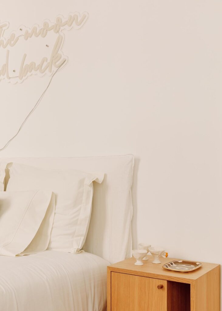 A luz desempenha um papel protagonista em toda a casa. À medida que o dia evolui, a iluminação natural desloca-se pelas camadas de branco, acrescentando profundidade e emoção, enquanto peças de iluminação cuidadosamente seleccionadas reforçam a intimidade e o aconchego ao anoitecer.