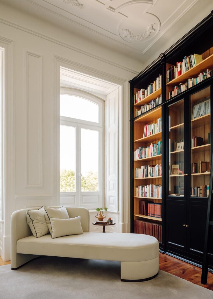 Os elementos arquitetónicos originais — pé-direito alto, cornijas ornamentadas, molduras de parede esculturais — foram preservados e valorizados como estrutura essencial do apartamento. Sobre este invólucro histórico, cada elemento contemporâneo foi introduzido com contenção e intenção.