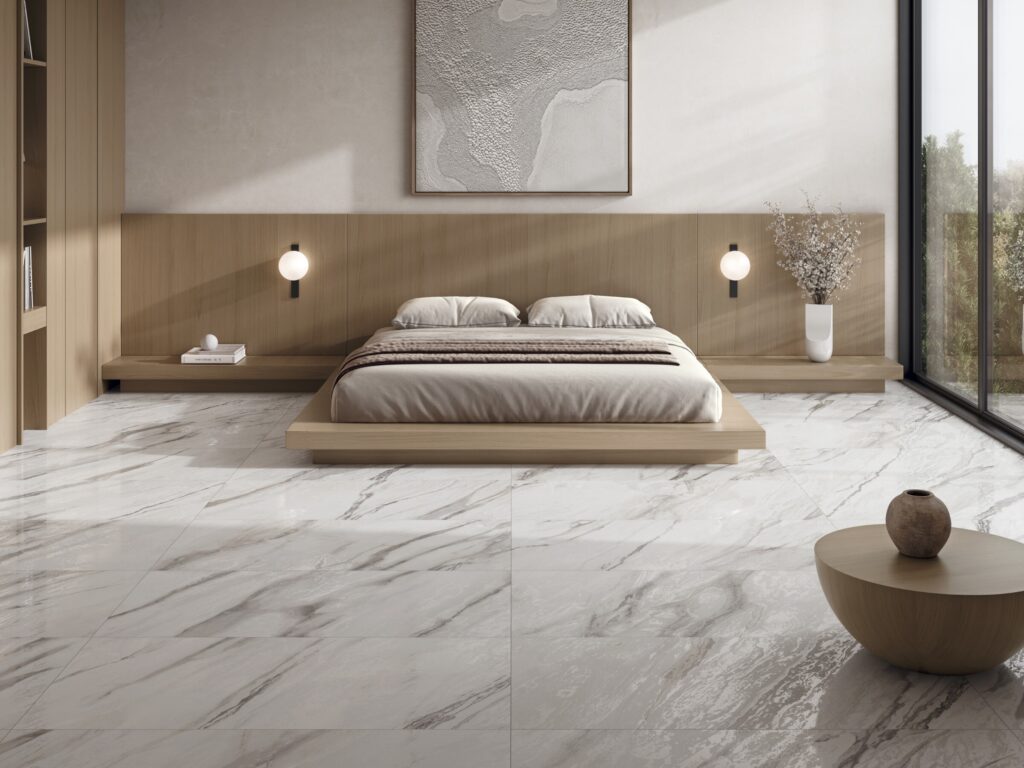 No quarto, a textura brilhante contrasta com a madeira natural, gerando um diálogo entre o mineral e o orgânico. O seu desempenho técnico é tão importante quanto a aparência. Os acabamentos — mate, polido, silk (mate sedoso) e lapado — oferecem diferentes graus de interação com a luz, permitindo adaptar o resultado a cada espaço. Nesta representa a luz construída, o mármore transformado num plano técnico onde cada junta, veia e reflexo fazem parte do design do espaço.