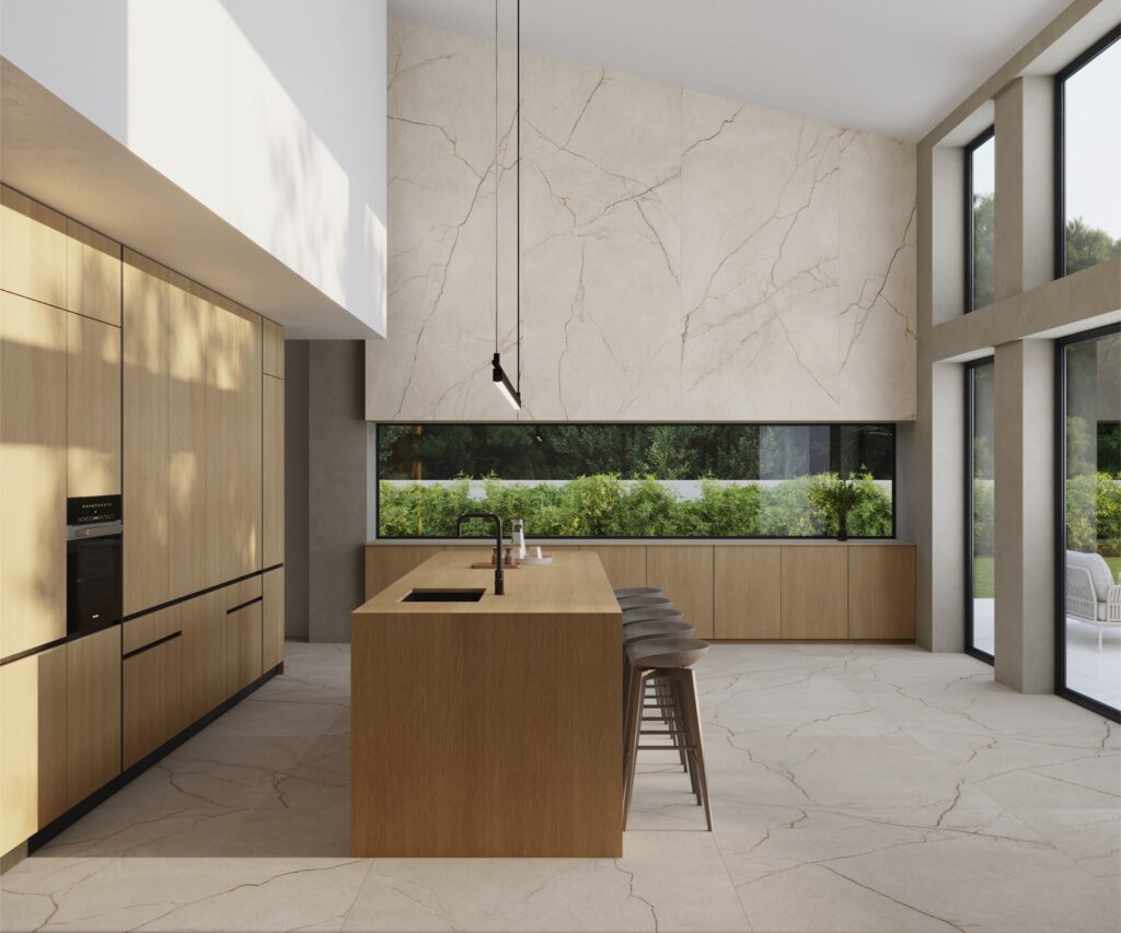 Na cozinha revestida com Raffaello, tanto no pavimento como em parte da parede, a cerâmica integra-se com a madeira e o betão numa composição contida. Os tons marfim do mármore Avorio di Segesta traduzem-se numa superfície quente e homogénea, onde a veia dourada se percebe como uma marca subtil. O resultado é uma atmosfera equilibrada e luminosa, ideal para projetos que procuram calma e continuidade.