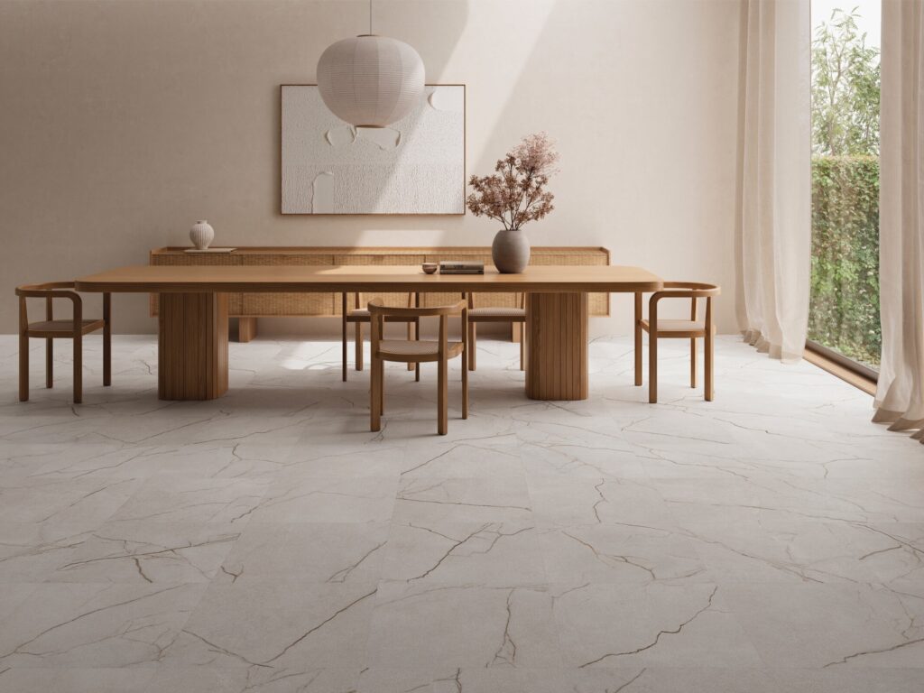 Na sala de jantar, a textura quase impercetível do material transforma-se num fundo neutro. A luz natural distribui-se de forma uniforme sobre a superfície, criando conforto visual e ampliando a sensação de espaço. A cerâmica atua como suporte silencioso, permitindo que a arquitetura, o mobiliário e a vegetação se integrem sob um mesmo tom. O detalhe da peça revela um trabalho de precisão gráfica: a veia dilui-se com naturalidade, sem repetições nem contrastes bruscos. Raffaello representa a superfície essencial dentro de Eterna: aquela que unifica, equilibra e dá coerência ao conjunto. É o material que não procura protagonismo, mas sim estabilidade visual; uma base sobre a qual se constrói o restante do projeto.