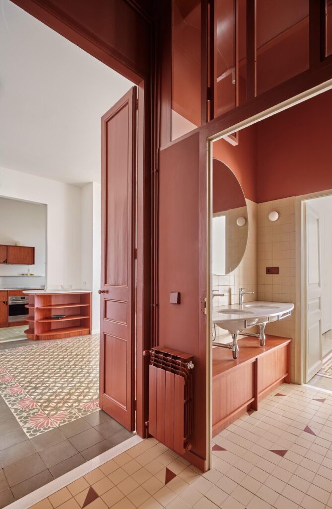 O tom avermelhado do Sapelli contrasta e harmoniza-se com a restante paleta, chegando ao ponto de tingir tudo no espaço monocromático da área do vestiário. É um ambiente mais escuro, iluminado naturalmente através do WC e do hall de entrada, para criar uma atmosfera mais íntima e acolhedora.