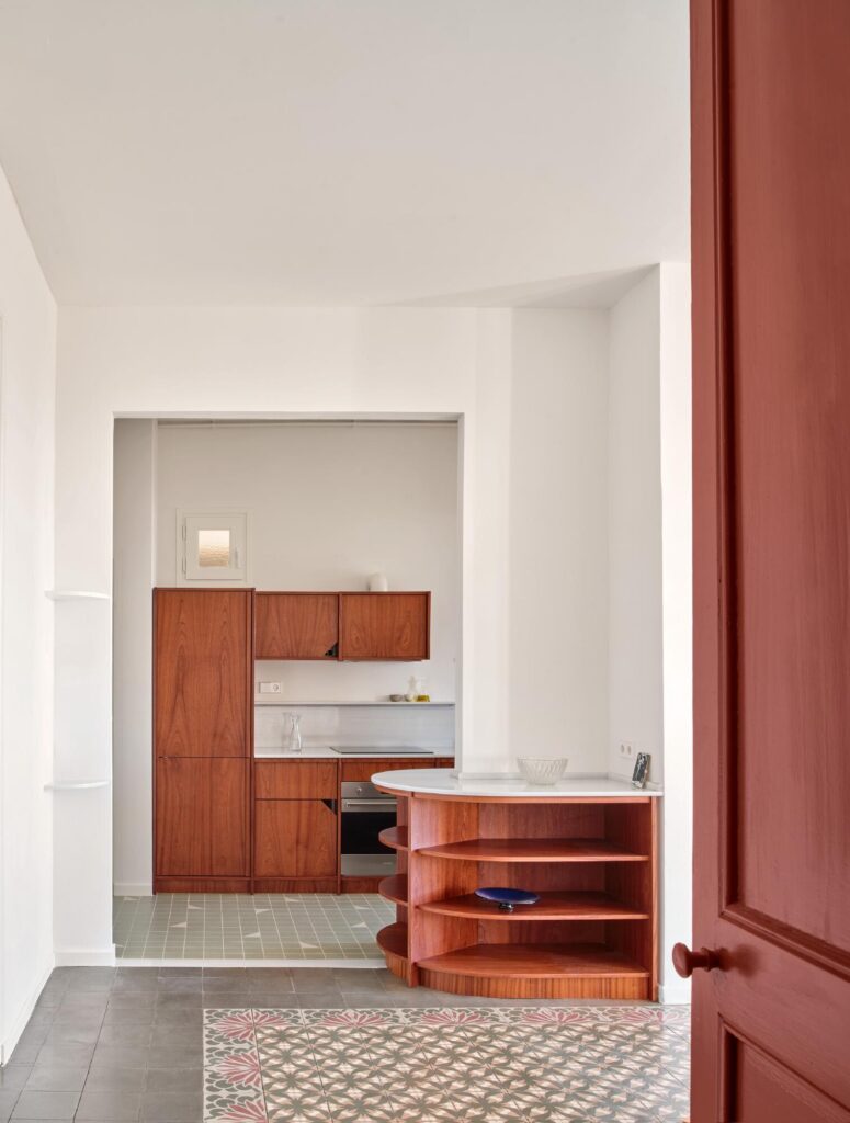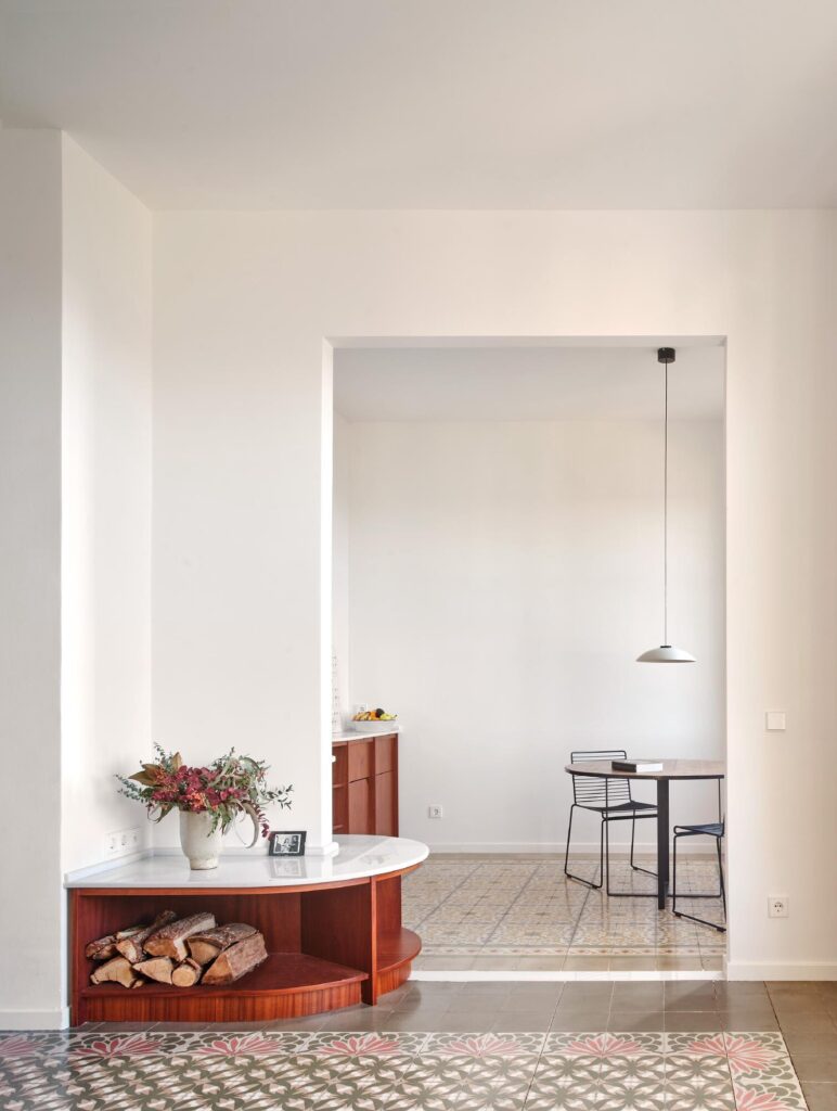 Algumas ligações existentes foram ampliadas e outras novas foram abertas para criar percursos circulares ao redor da lareira. Por fim, a cozinha estende-se em direção ao espaço de jantar, separado da sala. O mobiliário feito sob medida, finalizado em madeira natural e combinado com o piso original de ladrilhos hidráulicos, acrescenta calor e sofisticação ao interior da casa. Geometrias sinuosas dominam todos os elementos: cantos arredondados, espelho e janela circulares, bancadas giratórias.