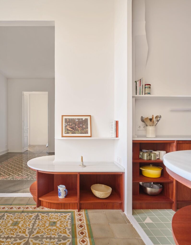 A estratégia bicolor também foi aplicada ao próprio mobiliário, com mudanças de material em diferentes alturas conforme o uso, combinando madeira com mármore Macael e prateleiras de melamina branca que se fundem com as paredes. A proposta transformou significativamente a espacialidade do apartamento e cuidou atentamente de cada detalhe com precisão e sensibilidade.