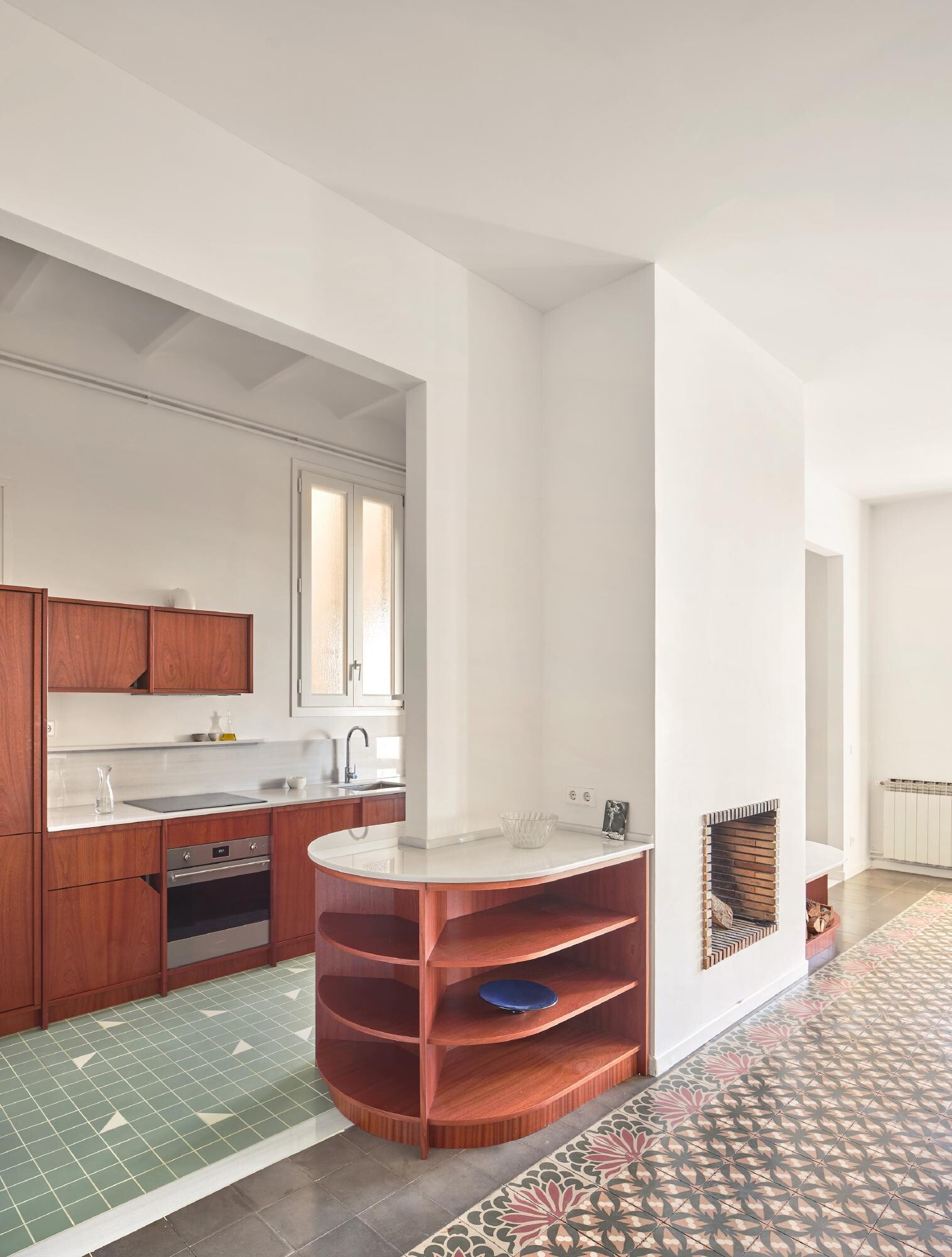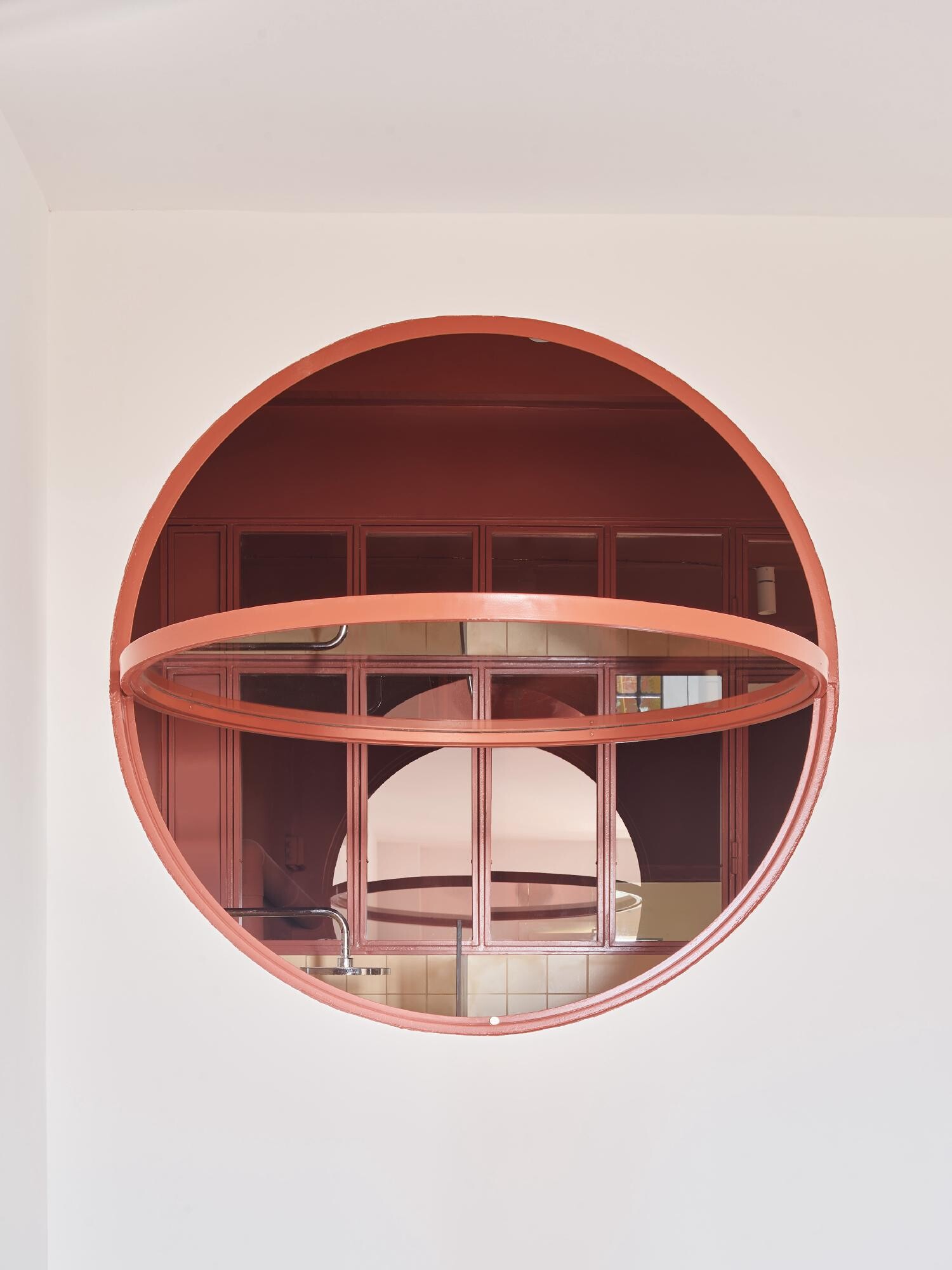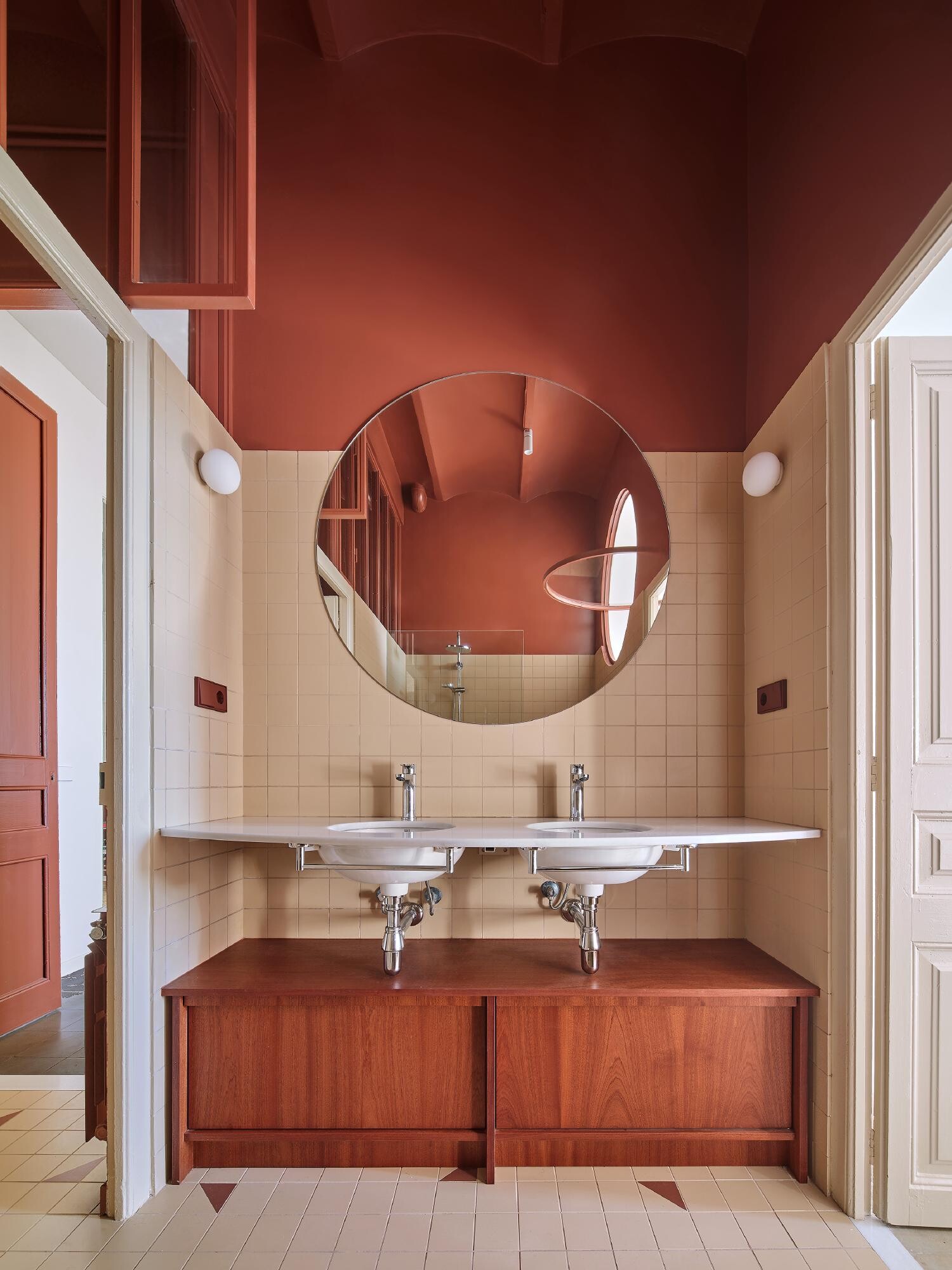 Algumas ligações existentes foram ampliadas e outras novas foram abertas para criar percursos circulares ao redor da lareira. Por fim, a cozinha estende-se em direção ao espaço de jantar, separado da sala. O mobiliário feito sob medida, finalizado em madeira natural e combinado com o piso original de ladrilhos hidráulicos, acrescenta calor e sofisticação ao interior da casa. Geometrias sinuosas dominam todos os elementos: cantos arredondados, espelho e janela circulares, bancadas giratórias.