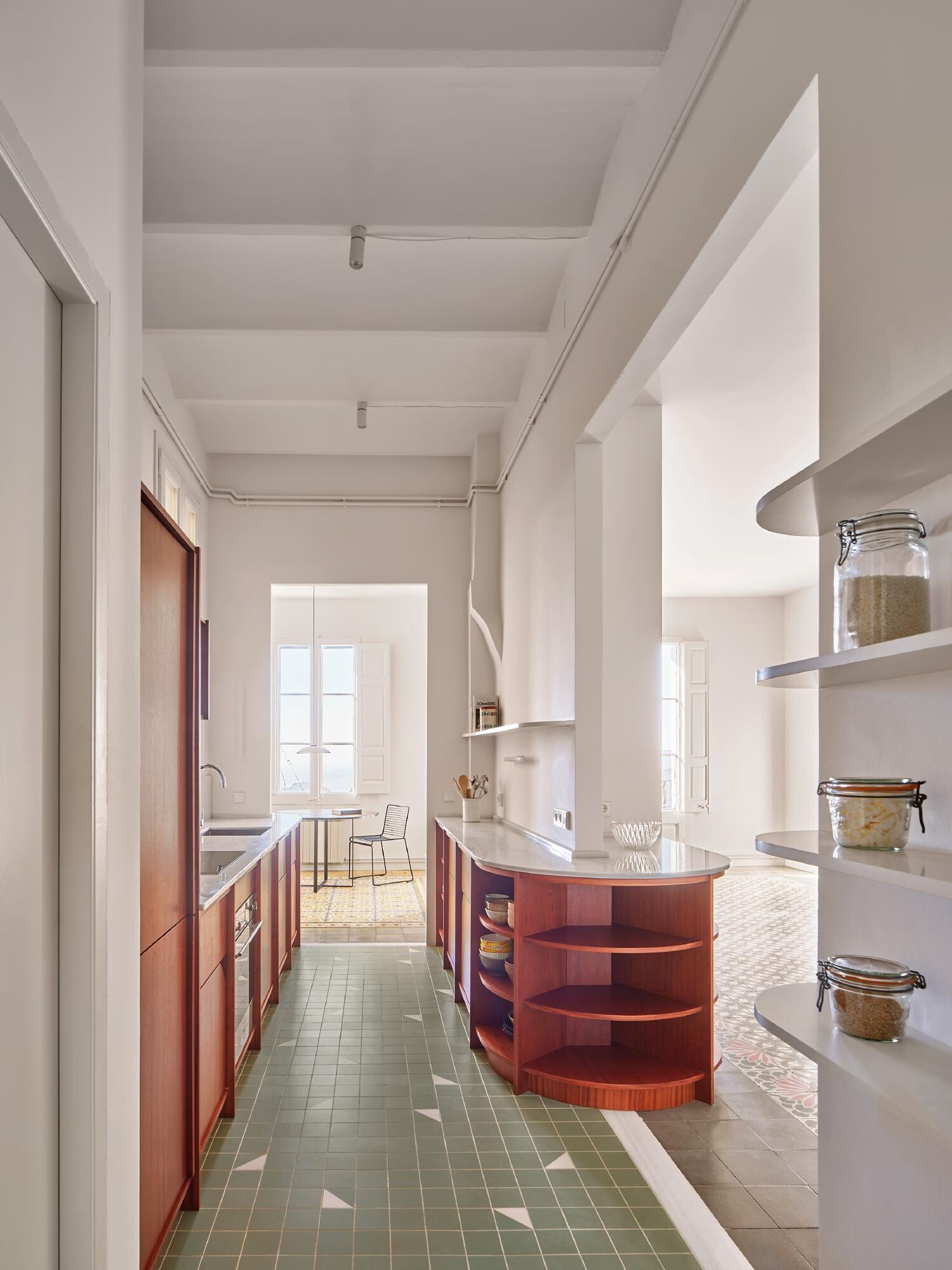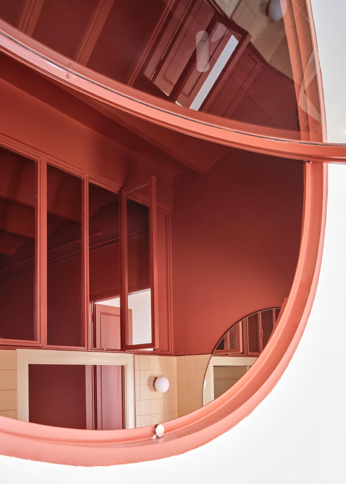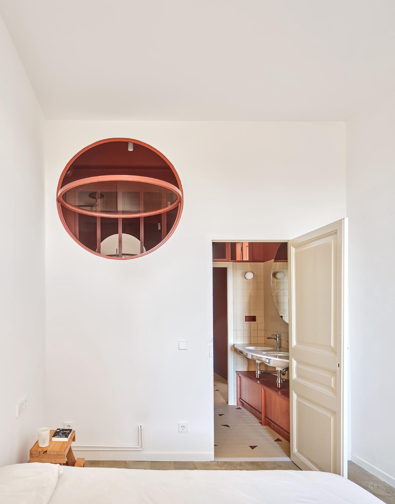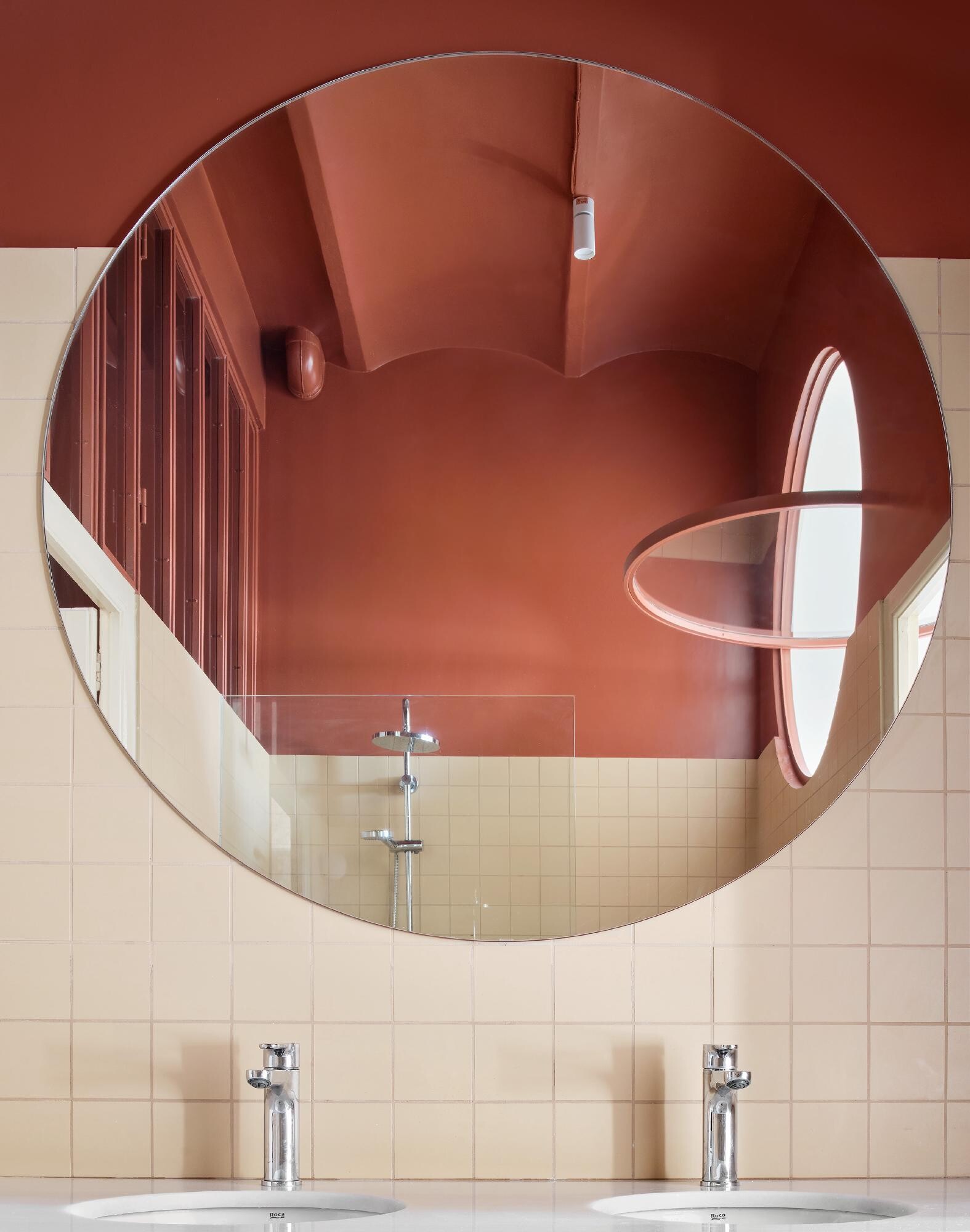 Algumas ligações existentes foram ampliadas e outras novas foram abertas para criar percursos circulares ao redor da lareira. Por fim, a cozinha estende-se em direção ao espaço de jantar, separado da sala. O mobiliário feito sob medida, finalizado em madeira natural e combinado com o piso original de ladrilhos hidráulicos, acrescenta calor e sofisticação ao interior da casa. Geometrias sinuosas dominam todos os elementos: cantos arredondados, espelho e janela circulares, bancadas giratórias.