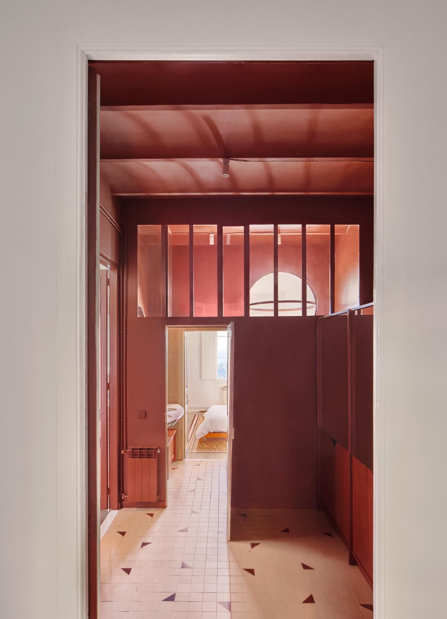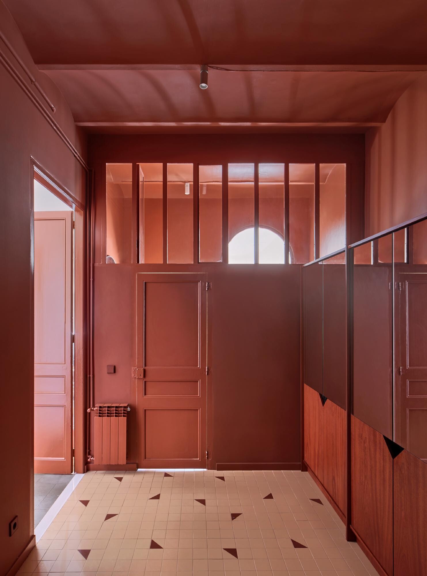 O tom avermelhado do Sapelli contrasta e harmoniza-se com a restante paleta, chegando ao ponto de tingir tudo no espaço monocromático da área do vestiário. É um ambiente mais escuro, iluminado naturalmente através do WC e do hall de entrada, para criar uma atmosfera mais íntima e acolhedora.