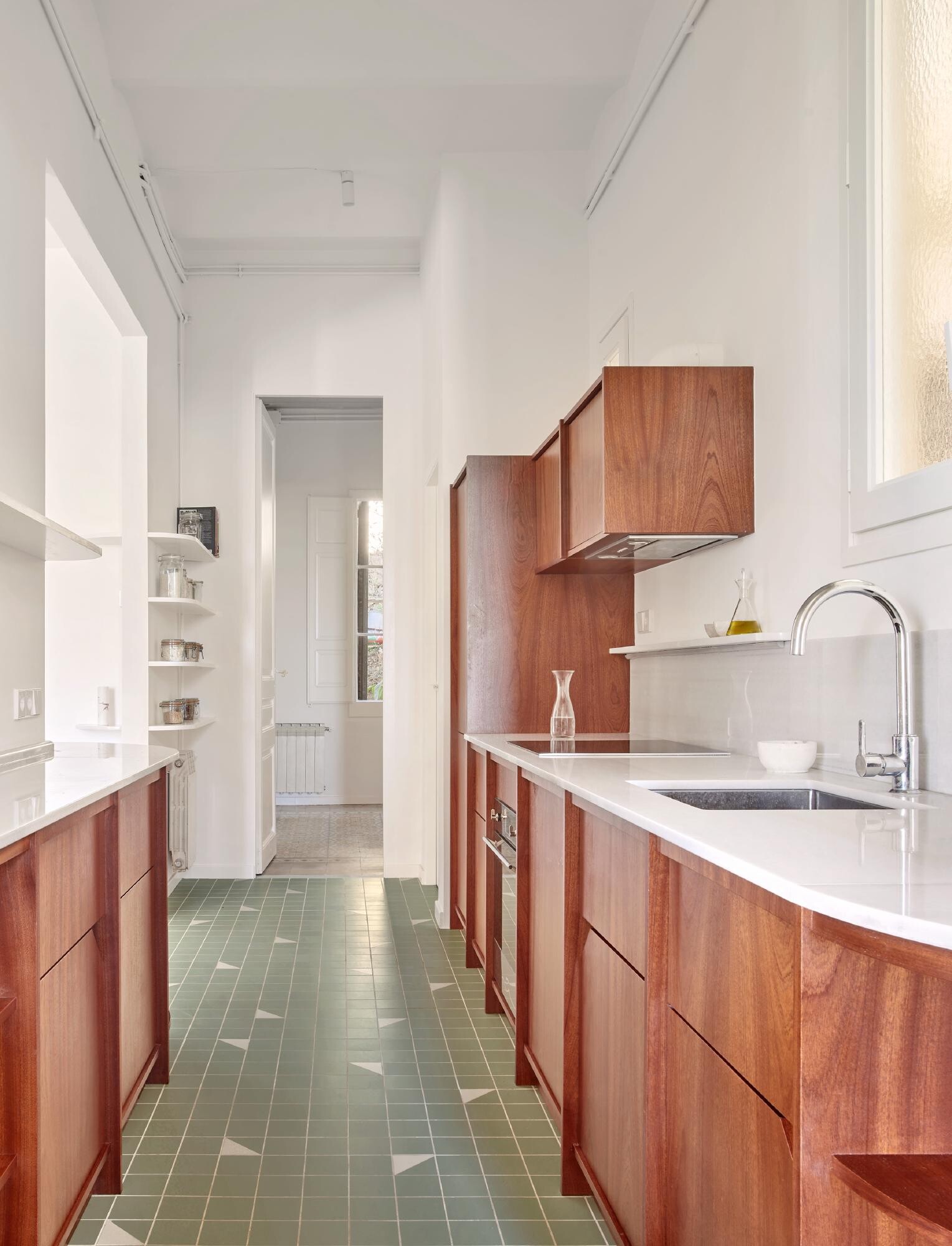 Para renovar os pisos da cozinha, do WC e do vestiário, foi usada a paleta de cores já existente nos espaços adjacentes, optando-se por uma combinação bicolor que gera um padrão aparentemente aleatório, modernizando o conceito de mosaico. O formato 10×10 cm, múltiplo do mosaico hidráulico, dá origem a formas geométricas triangulares ao cortar as peças diagonalmente, ao meio. O mesmo tamanho e a mesma forma são replicados nos puxadores das portas.
