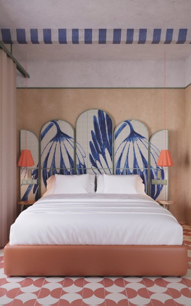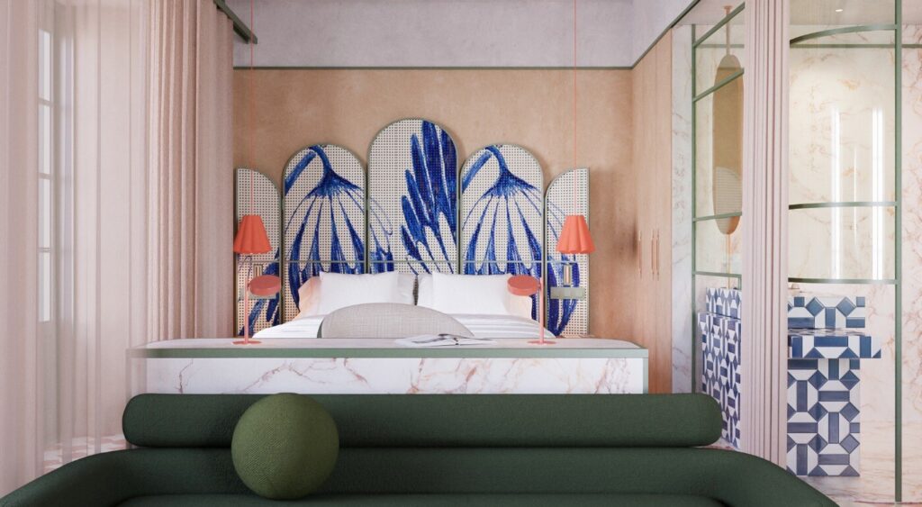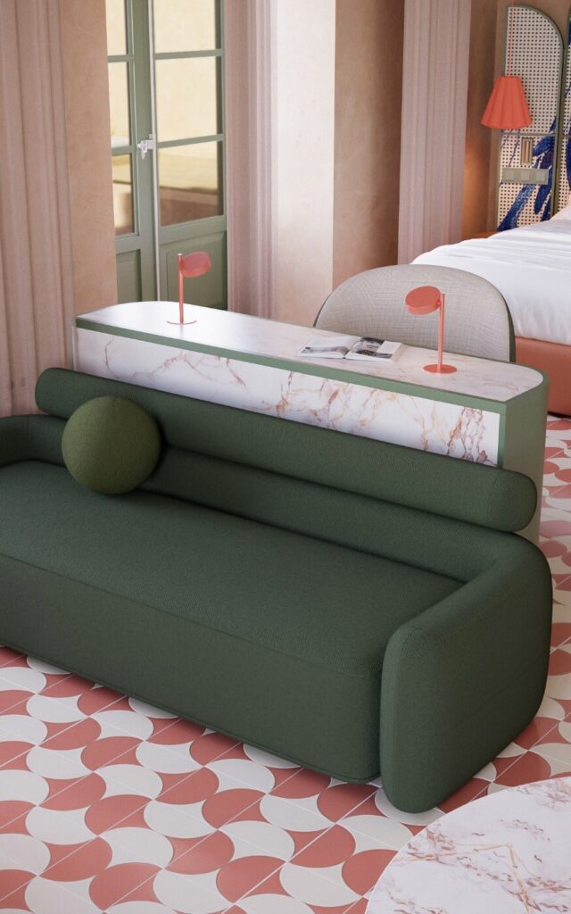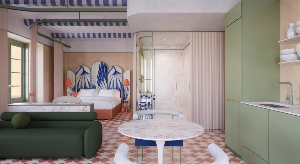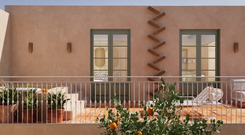 O design incorpora igualmente detalhes em cerâmica que reforçam a ligação à tradição local; o mobiliário e os acessórios contemporâneos, de formas orgânicas e linhas depuradas, refletem um equilíbrio perfeito entre o moderno e o tradicional.