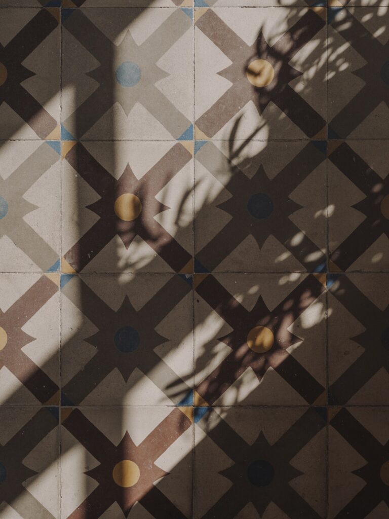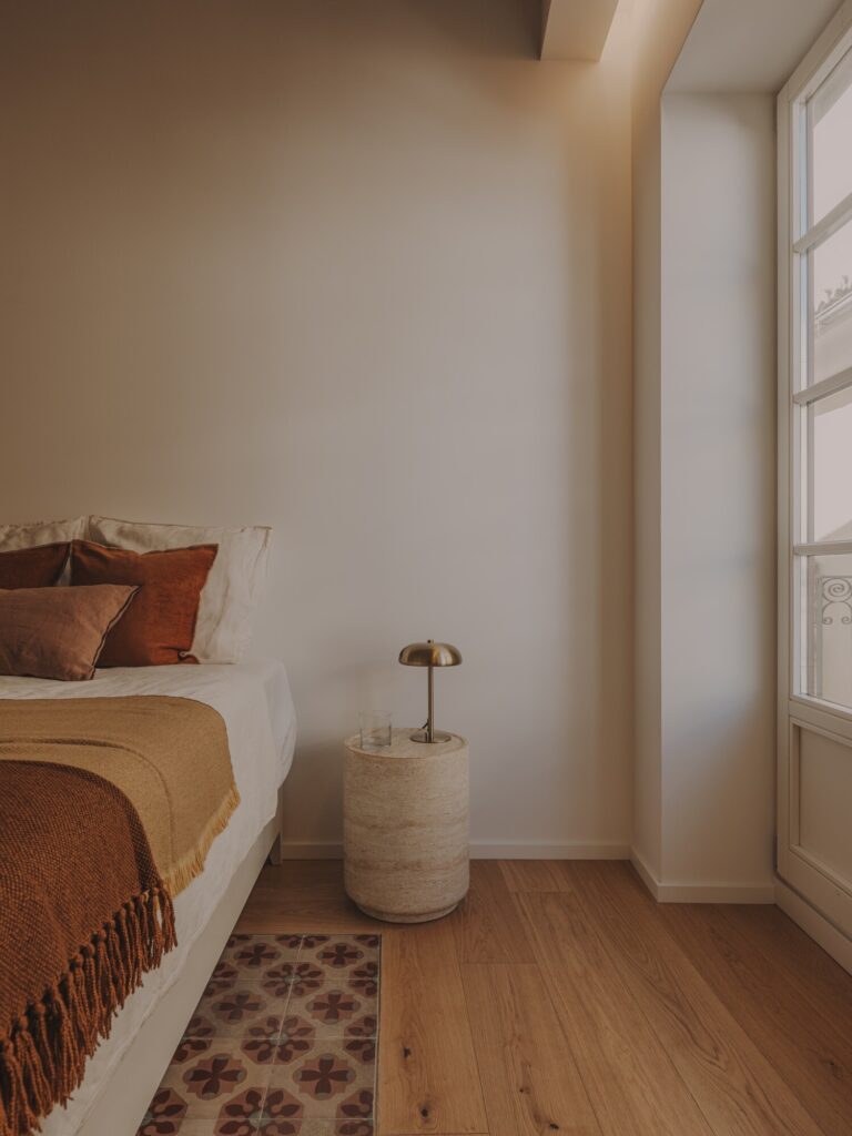 O ladrilho hidráulico funciona como elemento de continuidade, prolongando e conectando os espaços na zona social, mais fluida, enquanto na zona privada é introduzida a madeira, conferindo maior sensação de conforto e acolhimento. Nos quartos, explora-se o contraste entre o pavimento de madeira e o ladrilho hidráulico, desenhando uma espécie de tapetes onde o mosaico original surge à vista, criando uma atmosfera constante e coerente em toda a casa.