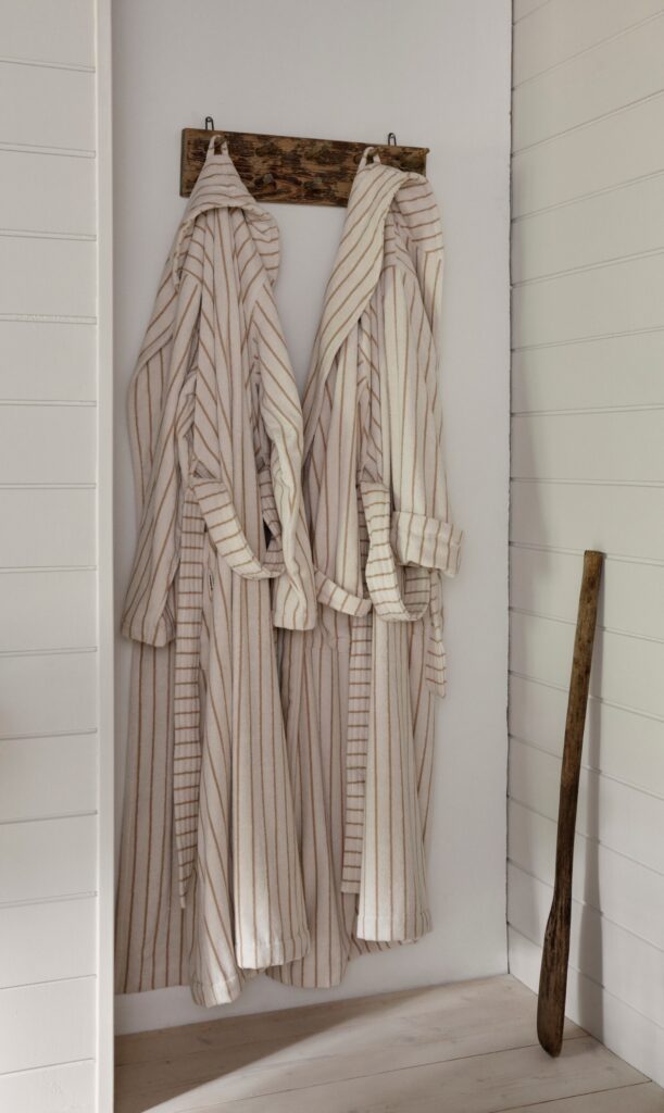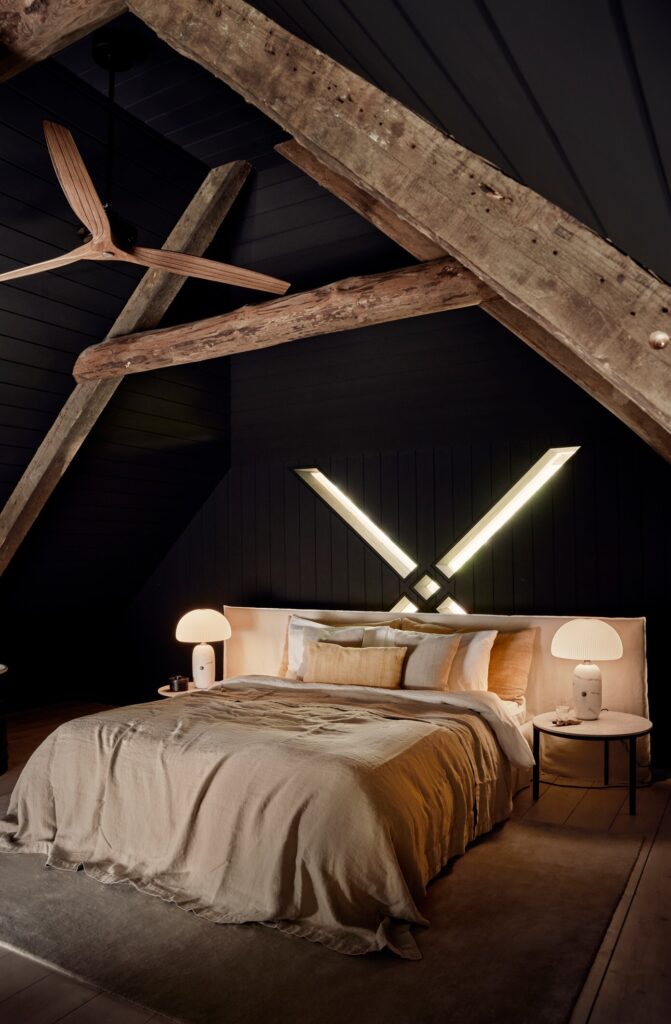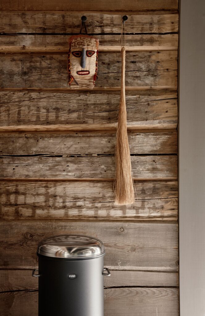No piso térreo encontra-se um segundo quarto com duas camas individuais, uma casa de banho, hall de entrada e a área social com cozinha integrada. O teto histórico, pintado num tom castanho-acinzentado escuro, e as paredes de troncos em madeira criam uma atmosfera densa e acolhedora, equilibrada pelo mobiliário de tons neutros da Vipp, peças artesanais locais e elementos vintage.