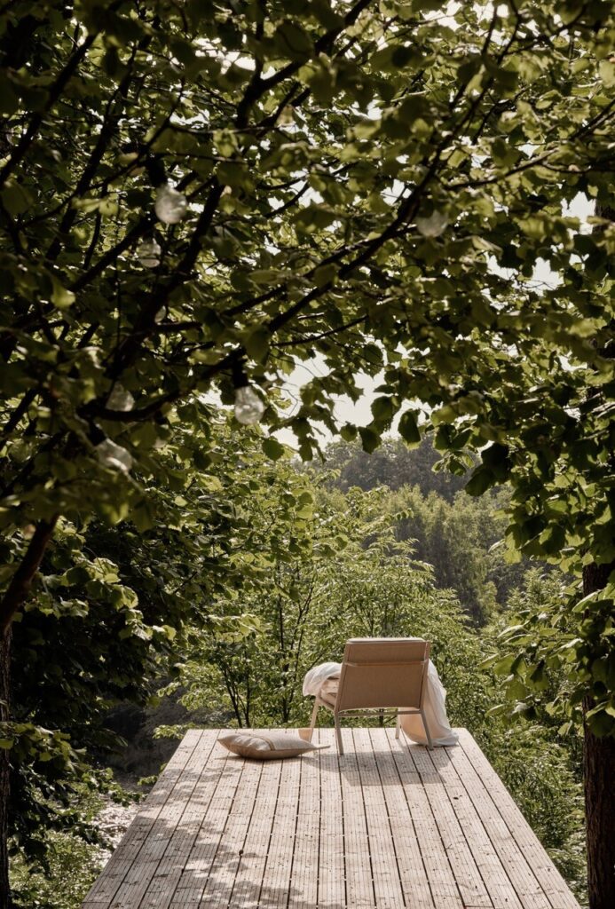 As áreas exteriores incluem zonas de descanso com mobiliário Vipp, orientadas para o rio, e uma banheira de hidromassagem aquecida a lenha, localizada numa plataforma independente, com vista panorâmica de 360 graus sobre a paisagem natural.