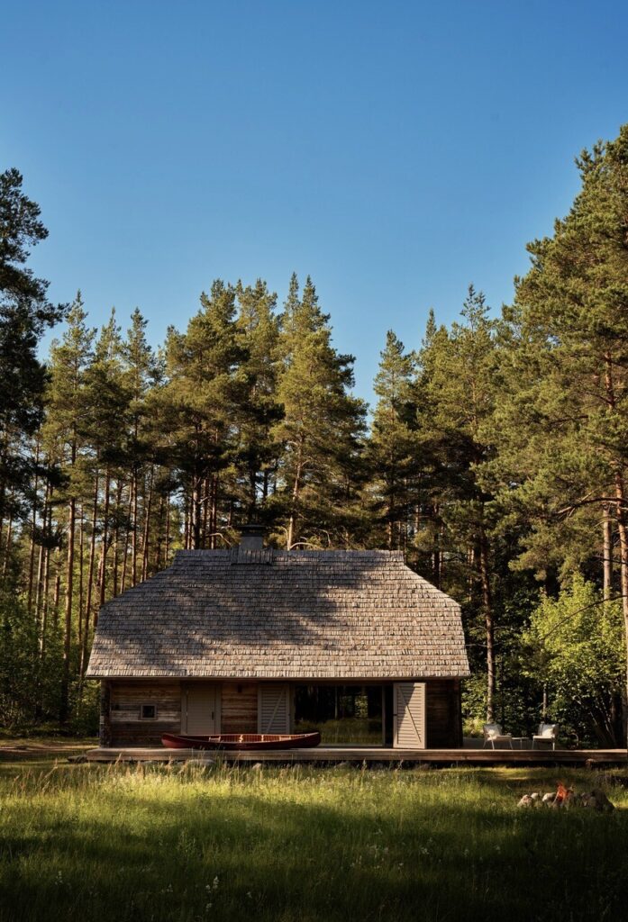 Originalmente utilizada como estalagem de estrada entre Riga e Wolmar, a casa classificada foi desmontada e posteriormente relocalizada na margem do Rio Salaca, onde renasce como um refúgio de design escandinavo integrado à floresta.
