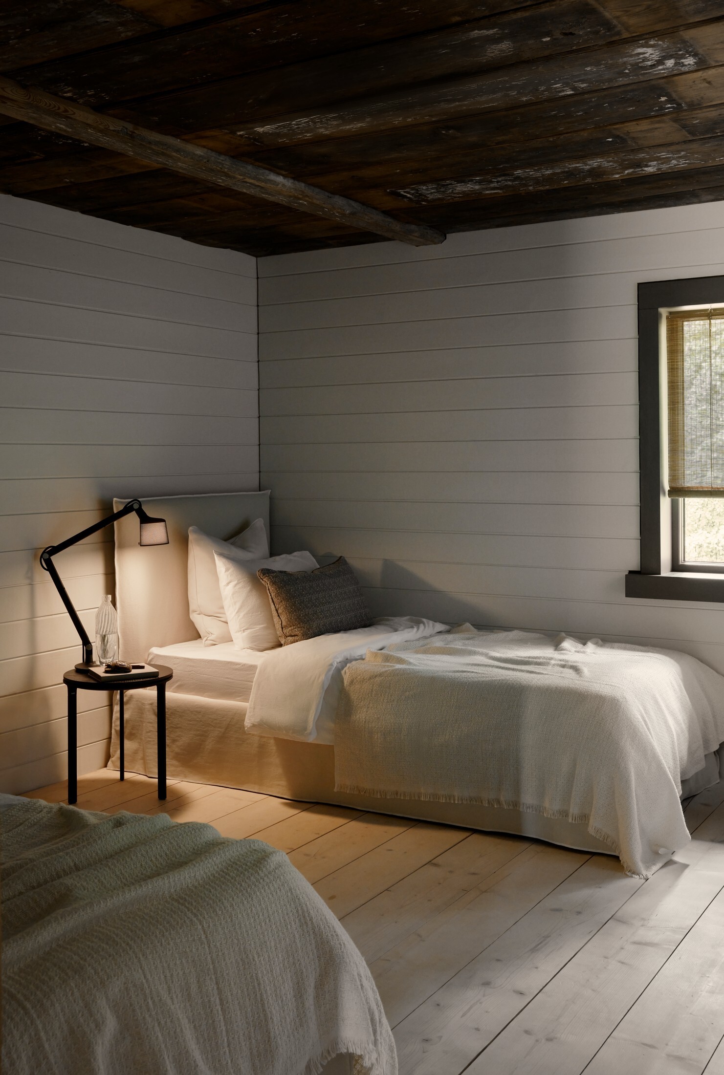 No piso térreo encontra-se um segundo quarto com duas camas individuais, uma casa de banho, hall de entrada e a área social com cozinha integrada. O teto histórico, pintado num tom castanho-acinzentado escuro, e as paredes de troncos em madeira criam uma atmosfera densa e acolhedora, equilibrada pelo mobiliário de tons neutros da Vipp, peças artesanais locais e elementos vintage.