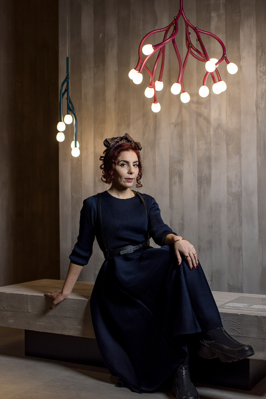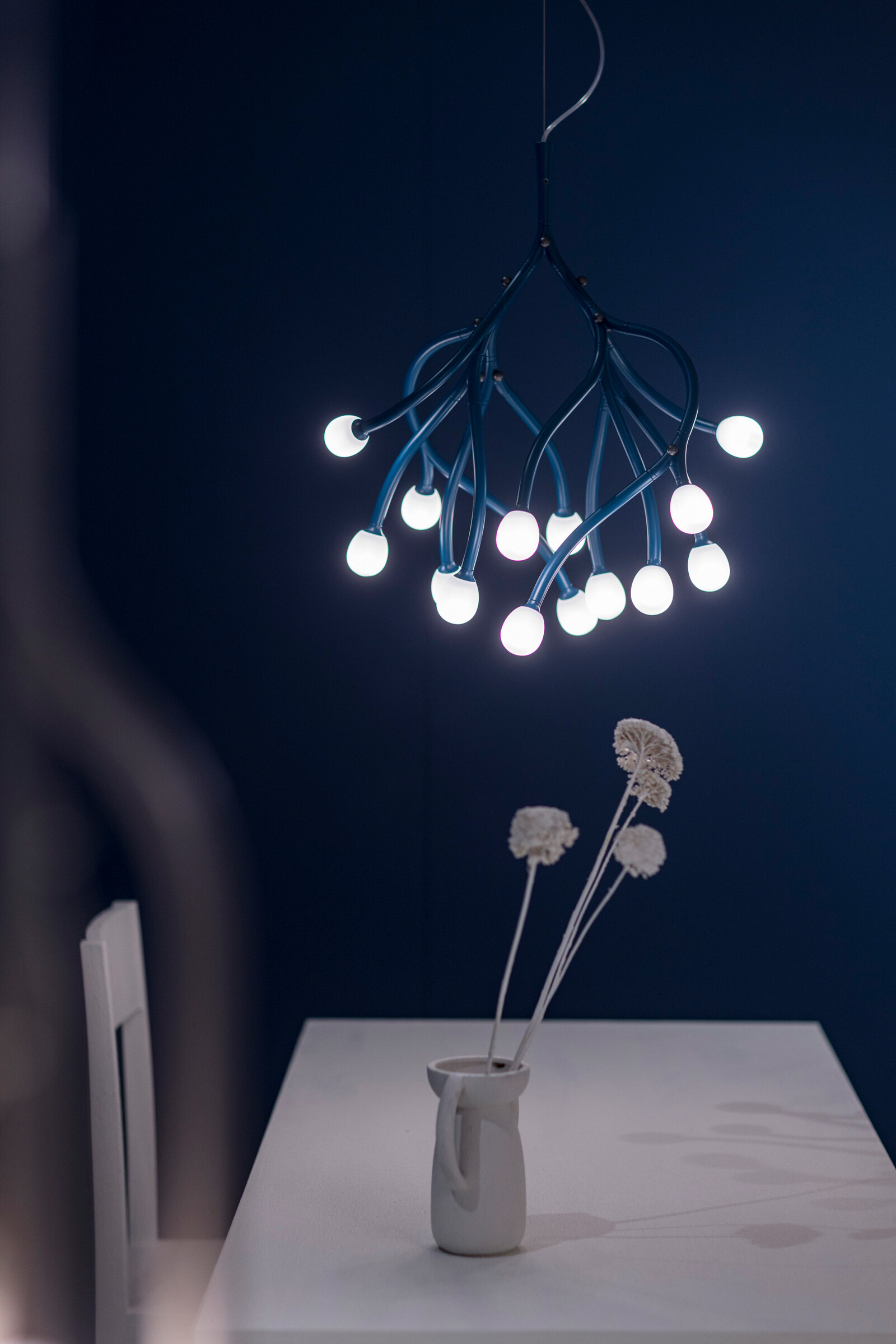 Cada detalhe desta nova paça criada por Francesca para a Foscarini tem uma função narrativa. Os pontos de conexão não são escondidos, são notas decorativas: pequenas esferas metálicas contrastantes que lembram brotos botânicos ou joias incrustadas.