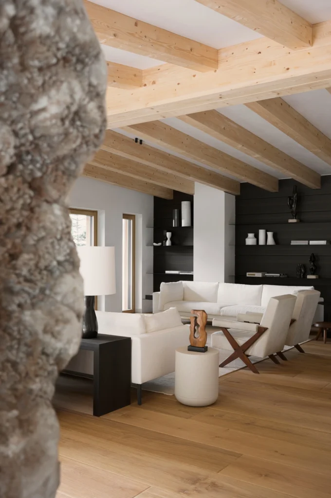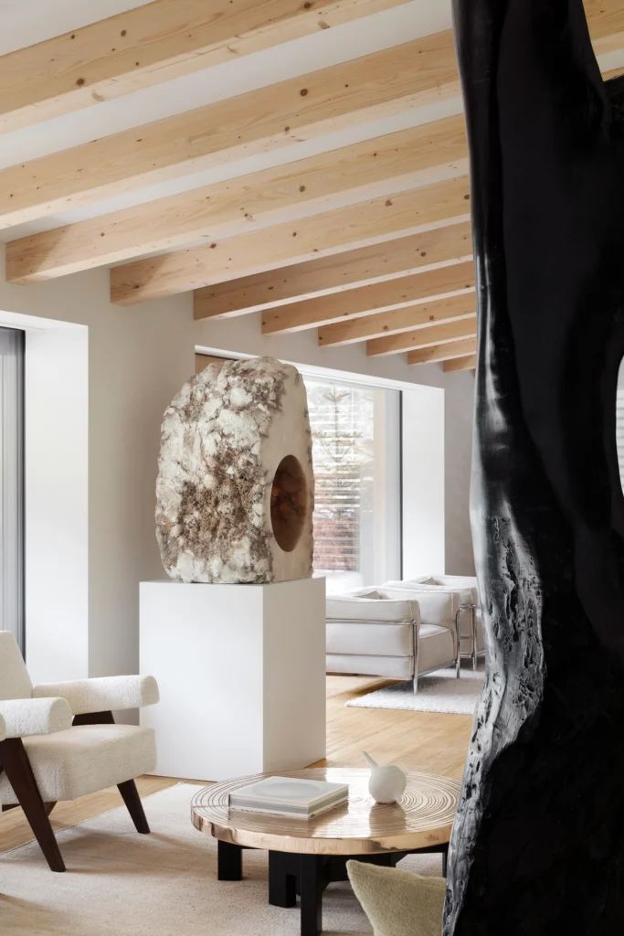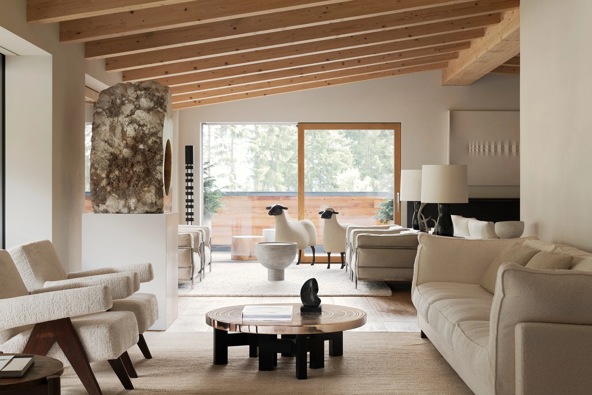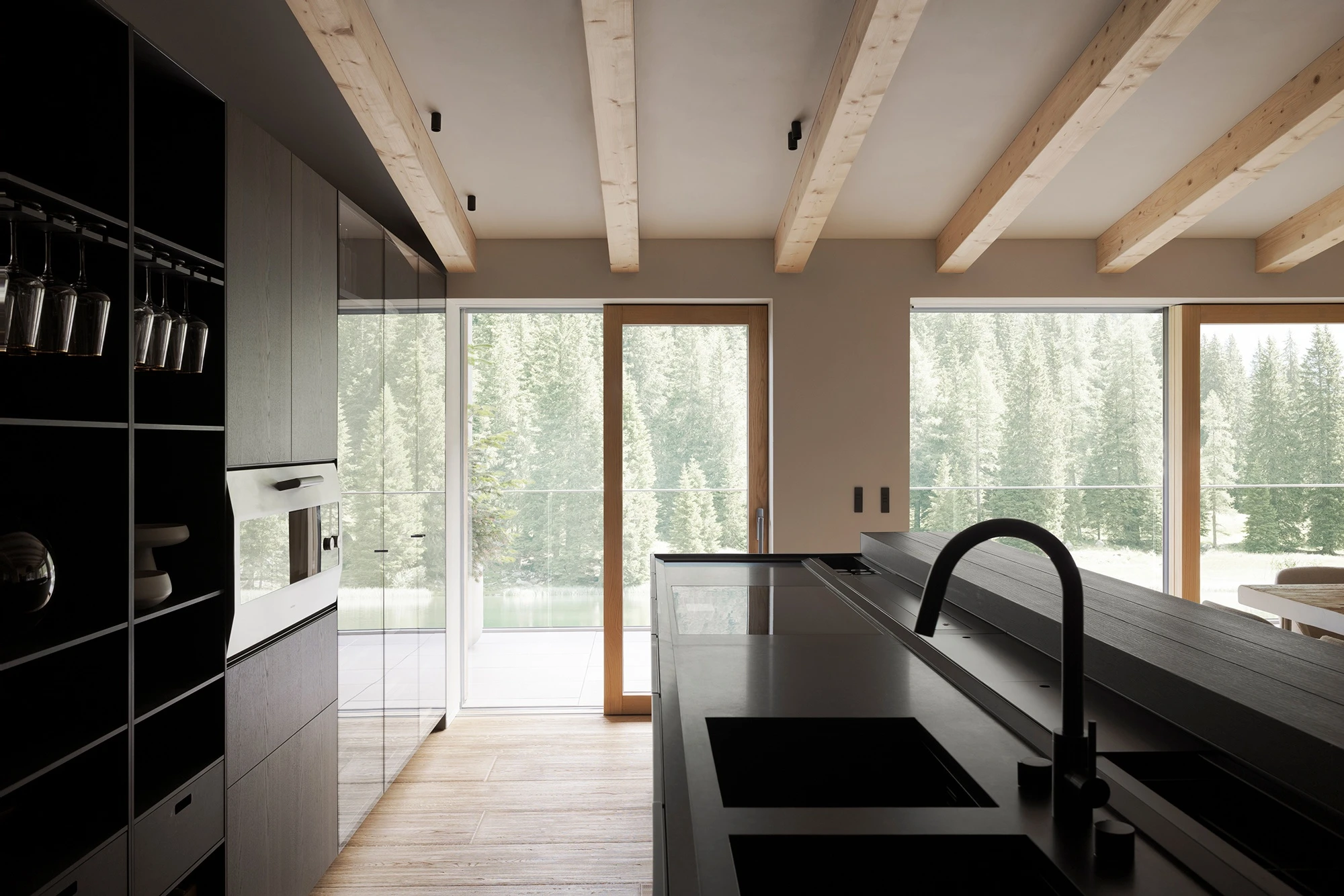 O coração da casa é formado por um espaço aberto com janelas de altura total que estabelecem um diálogo íntimo com a paisagem externa de bosques e montanhas – um ambiente que reúne três salas de estar interligadas e uma cozinha com área de jantar.