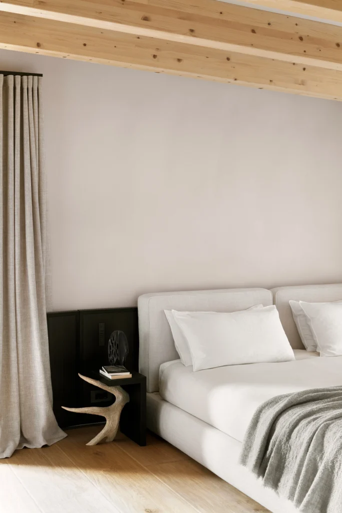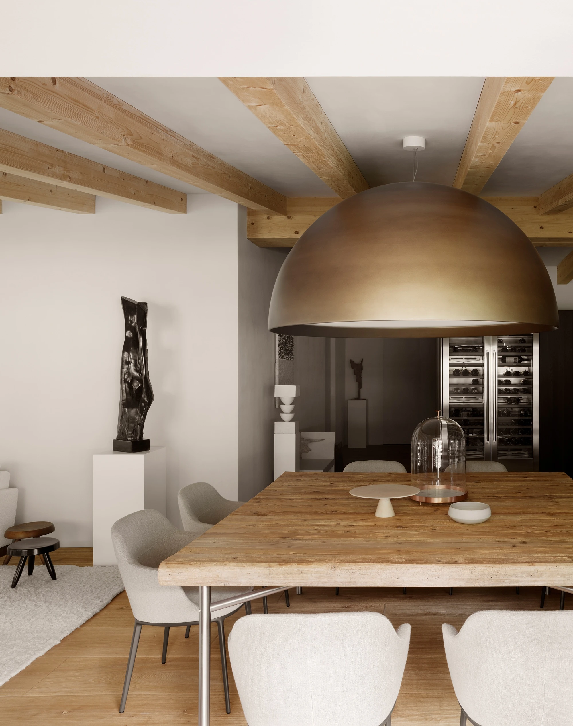 A área dos quartos é mais íntima: o conjunto de suítes totalmente independentes, cada uma com a sua própria casa de banho privativa, abre-se para o terraço que circunda todo o apartamento. Os materiais de madeira rústica e pedra, típicos das casas de montanha, são aqui reinterpretados segundo um olhar contemporâneo; na entrada, um grande painel feito sob medida revisita a marcenaria tradicional dos vales alpinos.