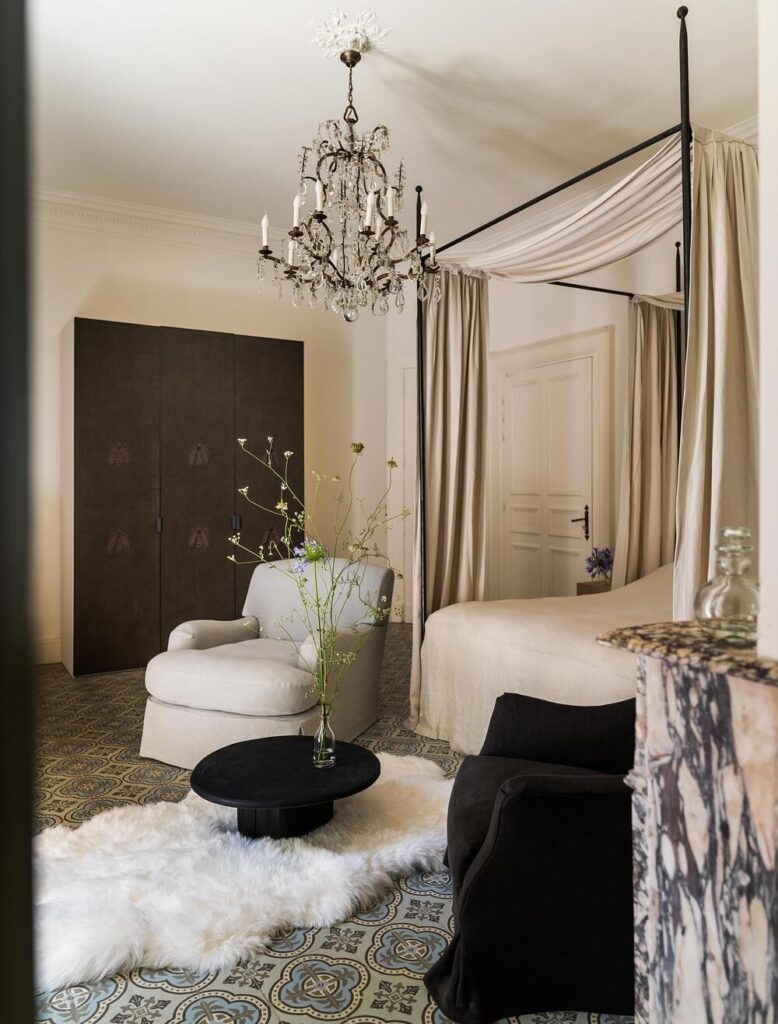 Neste projecto, os têxteis assumem um papel que ultrapassa a decoração: tornam-se âncoras espaciais. Os tecidos definem áreas, suavizam a acústica, enquadram vistas e introduzem uma sensação táctil de aconchego normalmente associada a ambientes domésticos. Para um projecto de hospitalidade, a Marianne Tiegen Interiors fez um uso estratégico dos têxteis, concentrando-se em elementos-chave como dosséis, biombos, colchas e painéis de parede, criando intimidade e conforto sem se sobrepor à arquitectura clássica.