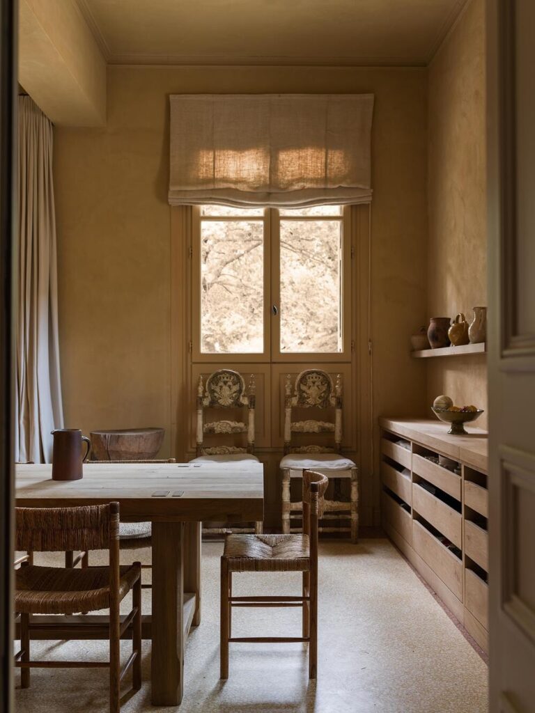 A par de novos tecidos de linho, cânhamo e algodão tingidos naturalmente, o projecto integra uma selecção cuidada de têxteis antigos — damascos provençais, estampagens venezianas em bloco e excedentes de tecidos de alta-costura — adquiridos através de uma rede de coleccionadores e antiquários construída ao longo de anos. Em muitos espaços, os têxteis antigos foram o ponto de partida: uma vez encontrados, a sua textura singular, pátina ou padrão ajudaram a definir toda a direcção do design. Noutros, o tom é dado por linhos ou cânhamos tingidos naturalmente, enriquecidos por variações subtis, profundidade e uma luminosidade silenciosa e viva.