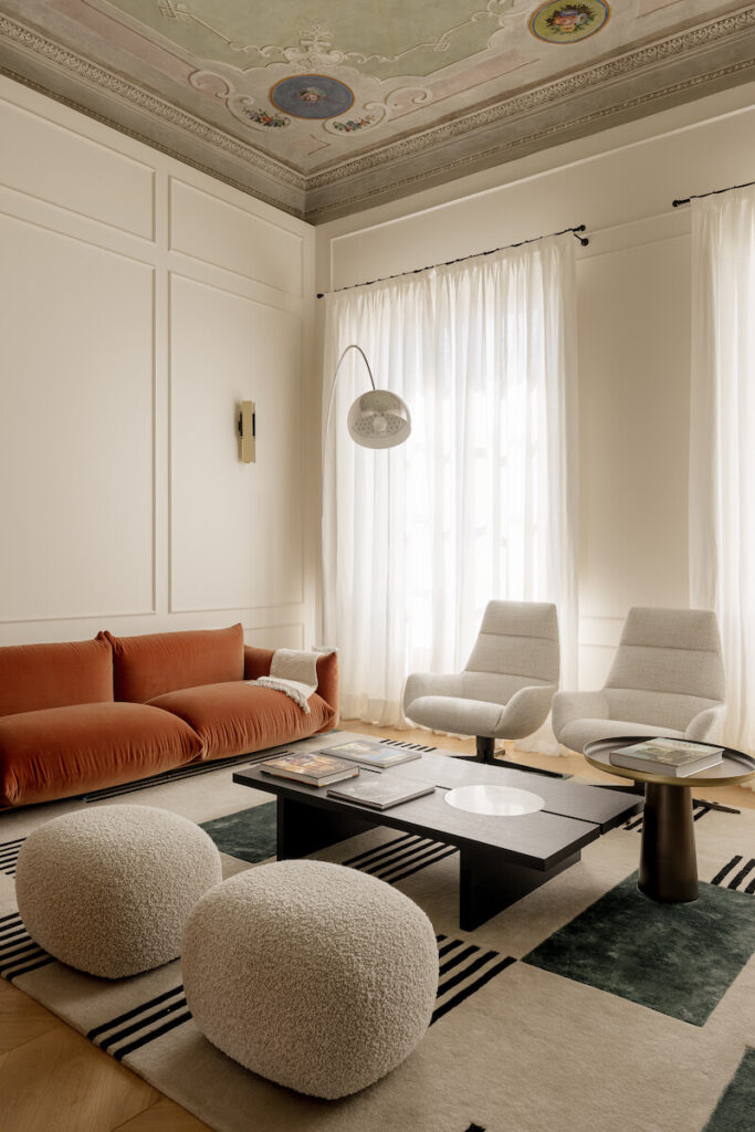 Com o restyling do apartamento, o estúdio preserva o caráter e a historicidade da arquitetura original: os magníficos tectos com frescos da época — autênticas obras-primas decorativas com motivos geométricos e florais — tornam-se protagonistas dos ambientes, realçados por uma abordagem que os integra harmoniosamente com peças de design contemporâneo.