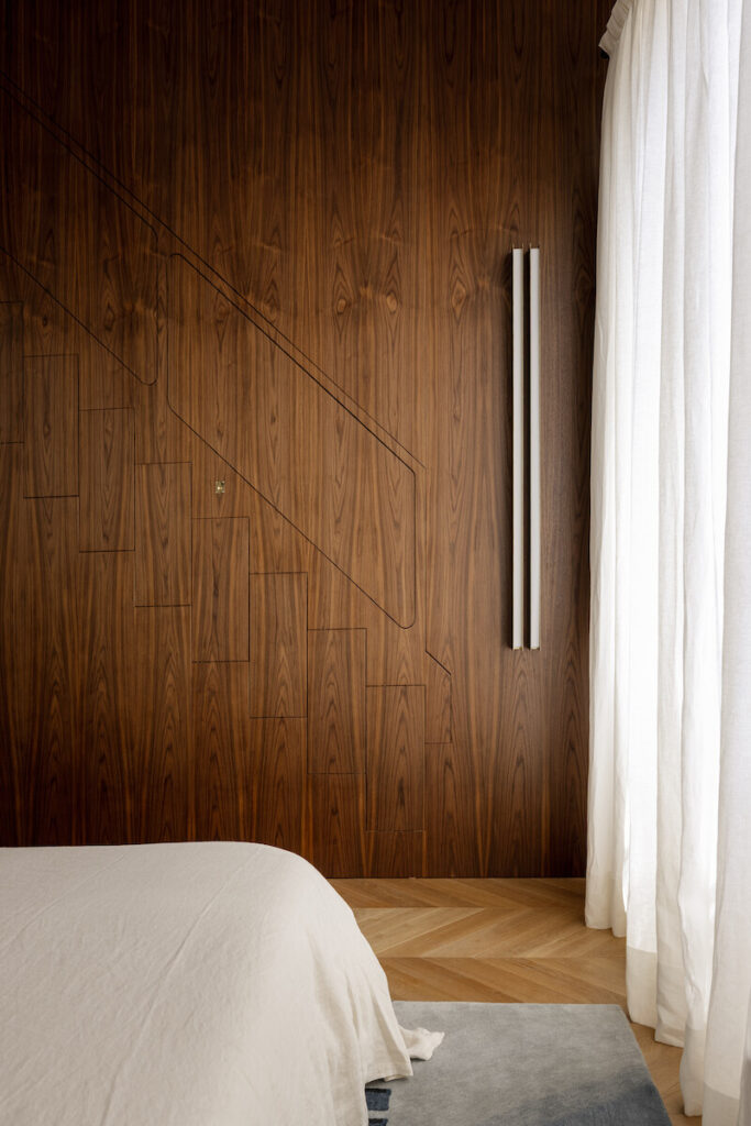 O elemento distintivo do projeto é, sem dúvida, a escada de madeira que literalmente “desaparece” na parede do quarto — um exemplo de uma arquitetura que se torna mágica. A escada, composta por degraus que parecem flutuar no vazio, foi projetada a partir de um desenho original da Pierattelli Architetture; graças a um mecanismo invisível, abre-se, rodando 90°, para conduzir a um mezanino-estúdio.