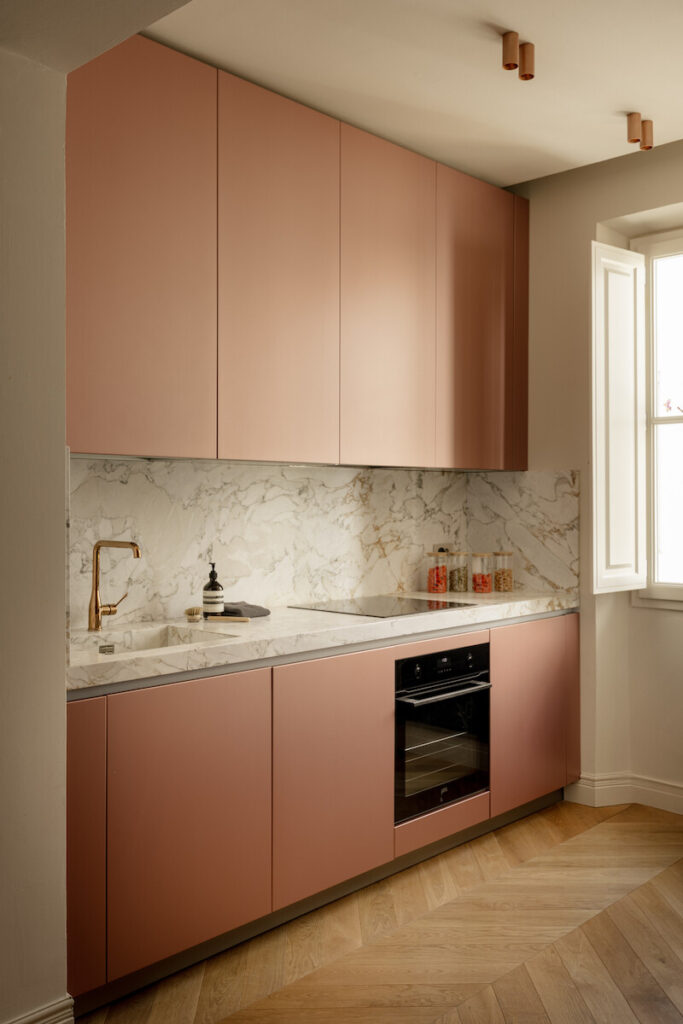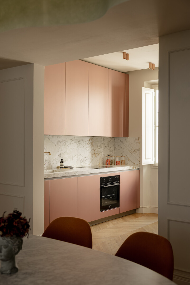 A cozinha, desenhada à medida pelo estúdio e realizada pela Elmar, é lacada num rosa metalizado, em perfeita harmonia com as tonalidades neutras das paredes e do parquet. No quarto, o protagonista é a cama Biombo da Cassina, revestida em veludo azul-noite, acompanhada por uma cómoda e uma aparador em nogueira, ambos desenhados pelo estúdio.