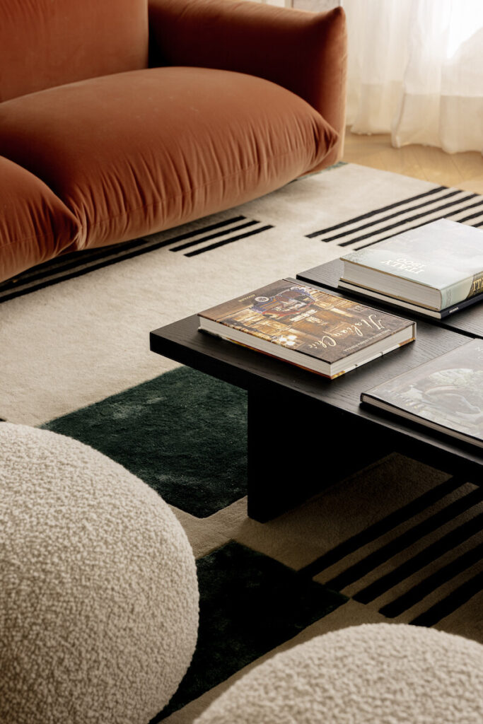 Na sala de estar, uma mesa de mármore da Cappellini dialoga com as linhas intemporais das cadeiras Saarinen Executive da Knoll, criando um equilíbrio entre rigor e conforto. No centro da cena, o sofá Marenco da Arflex, em veludo cor de ferrugem, introduz uma nota quente e envolvente, enquanto as poltronas Miki da Lema e um tapete da CC Tapis acrescentam dinamismo cromático. A atmosfera é completada por uma iluminação cenográfica, com as suspensões Nuvola da Baxter a marcar a zona de jantar e os apliques da Tooy a sublinhar a convivialidade da área social.
