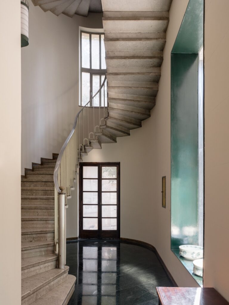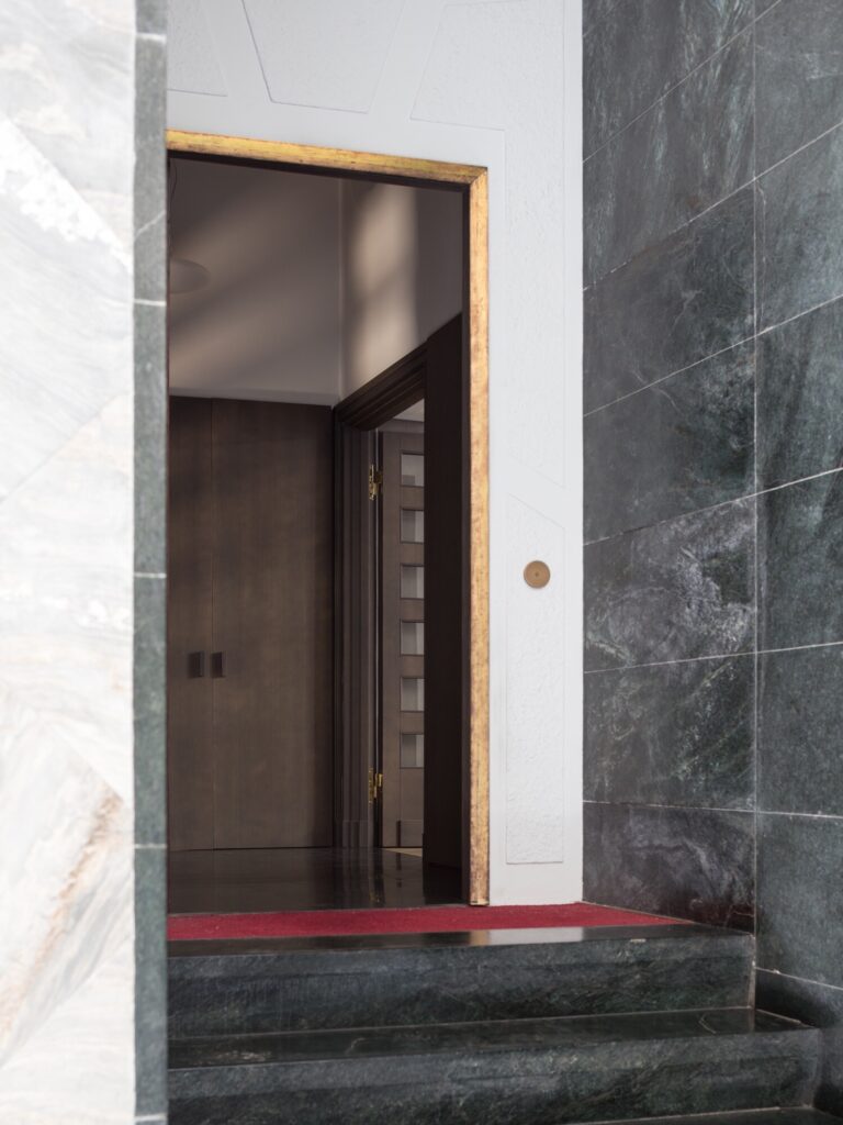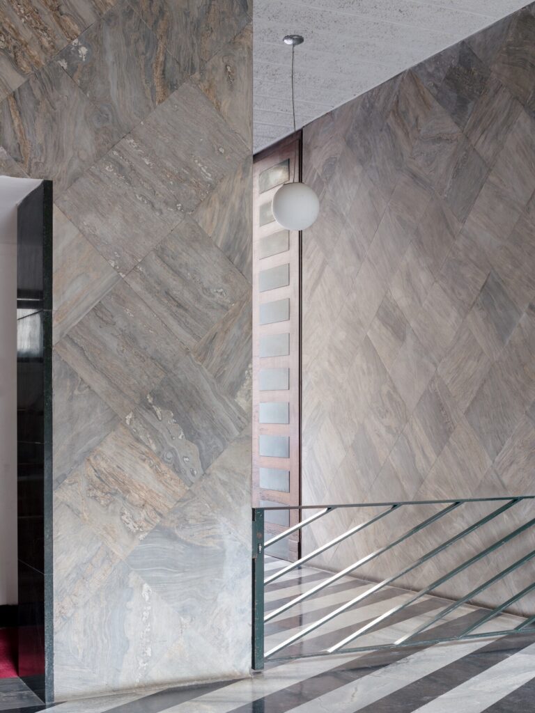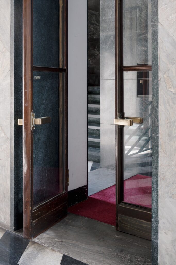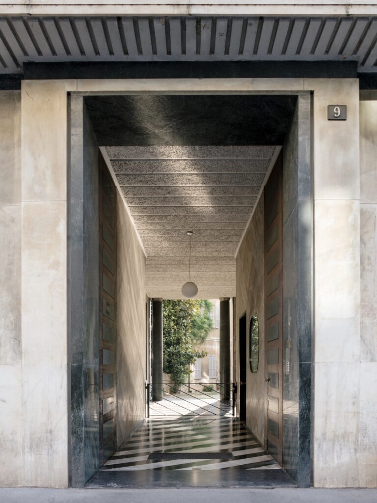 O átrio do condomínio é concebido como parte integrante do projecto. Ainda por restaurar, preserva o revestimento original das paredes em mármore Palissandro Blu (uma rara pedra italiana do Piemonte, caracterizada por veios azulados e castanhos, por vezes designada comercialmente como “Bluette”), aplicado em padrão losangular, solução retomada no pavimento do escritório. Os limiares e as escadas são executados em mármore Verde Alpi de primeira escolha, seleccionado pela escassez de inclusões e veios. O pavimento introduz ritmo e dinamismo através de faixas diagonais de mármore branco (Carrara de tonalidade acinzentada) e preto (Belgian Black absoluto), uma composição marcadamente vanguardista para a época. Outros elementos de destaque incluem o tecto em estuque listado (strollato), um candeeiro embutido sob um banco em mármore e a grande janela envidraçada que inunda a escada de luz — tudo situado num equilíbrio subtil entre o Novecento e o Modernismo.