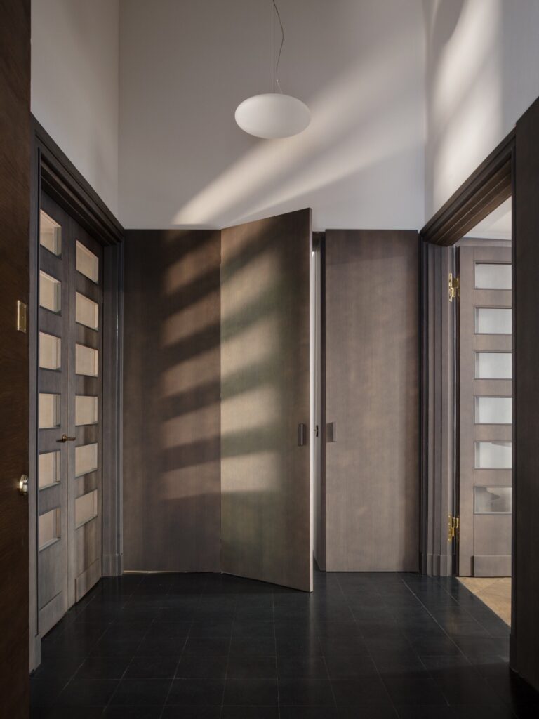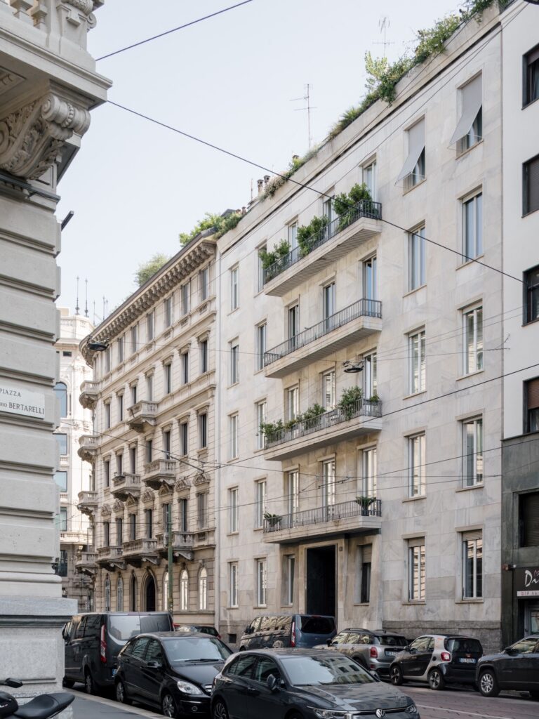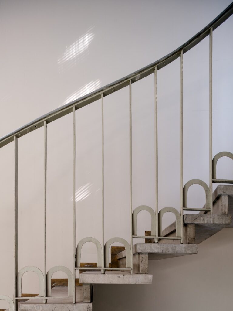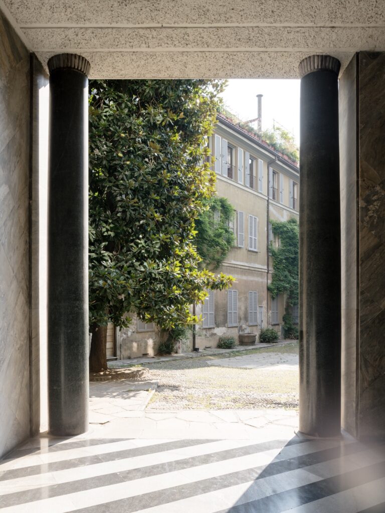 O átrio do condomínio é concebido como parte integrante do projecto. Ainda por restaurar, preserva o revestimento original das paredes em mármore Palissandro Blu (uma rara pedra italiana do Piemonte, caracterizada por veios azulados e castanhos, por vezes designada comercialmente como “Bluette”), aplicado em padrão losangular, solução retomada no pavimento do escritório. Os limiares e as escadas são executados em mármore Verde Alpi de primeira escolha, seleccionado pela escassez de inclusões e veios. O pavimento introduz ritmo e dinamismo através de faixas diagonais de mármore branco (Carrara de tonalidade acinzentada) e preto (Belgian Black absoluto), uma composição marcadamente vanguardista para a época. Outros elementos de destaque incluem o tecto em estuque listado (strollato), um candeeiro embutido sob um banco em mármore e a grande janela envidraçada que inunda a escada de luz — tudo situado num equilíbrio subtil entre o Novecento e o Modernismo.