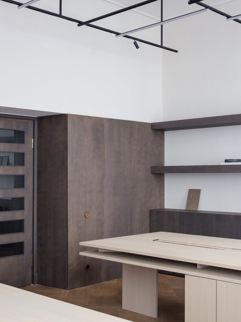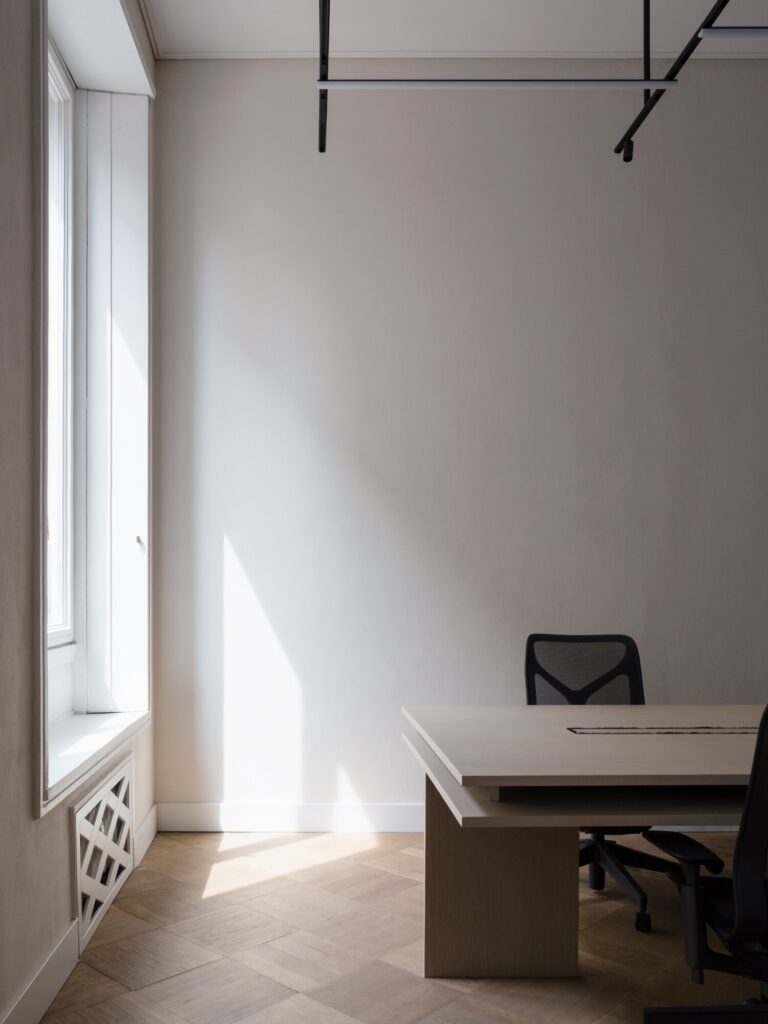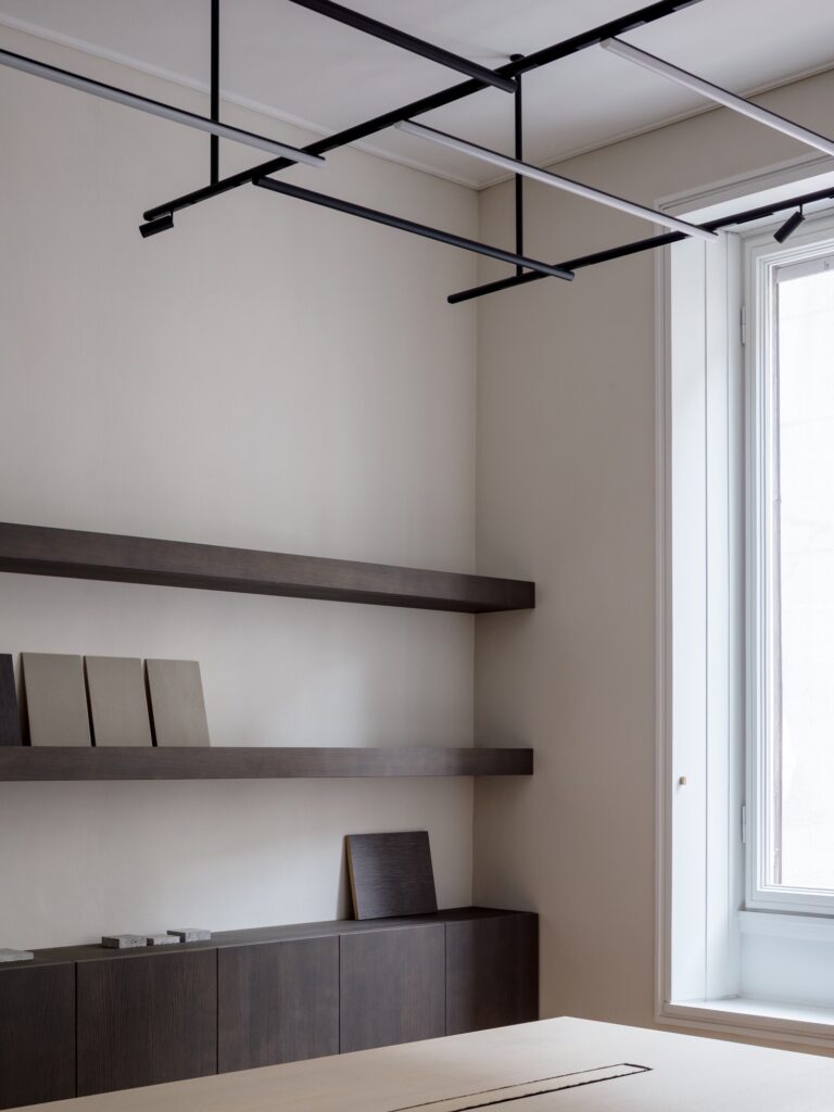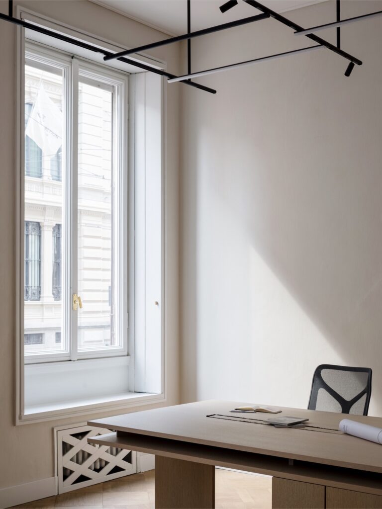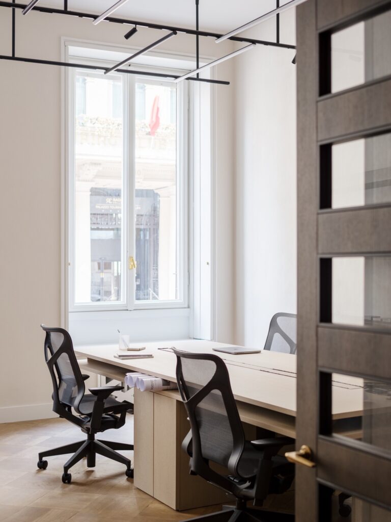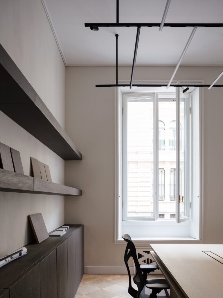 O mobiliário integrado, inteiramente desenhado à medida, define as funções de forma discreta: unidades de arrumação, consolas e mesas de trabalho em freixo branqueado estruturam o espaço sem comprometer a legibilidade histórica dos interiores. Na casa de banho, um amplo lavatório em mármore Verde Alpi ecoa as tonalidades do átrio. A sala de reuniões é enriquecida com clássicos do design: uma mesa dos anos 1940 de Paolo Buffa, cadeiras Indochine de Charlotte Perriand (Cassina) e o candeeiro 2109 de Sarfatti (Astep). A iluminação técnica é assegurada pelo sistema Infra-structure de Vincent Van Duysen (Flos), enquanto o átrio de entrada está pensado para acolher o candeeiro Lenticchia de Peter Zumthor (Viabizzuno).
